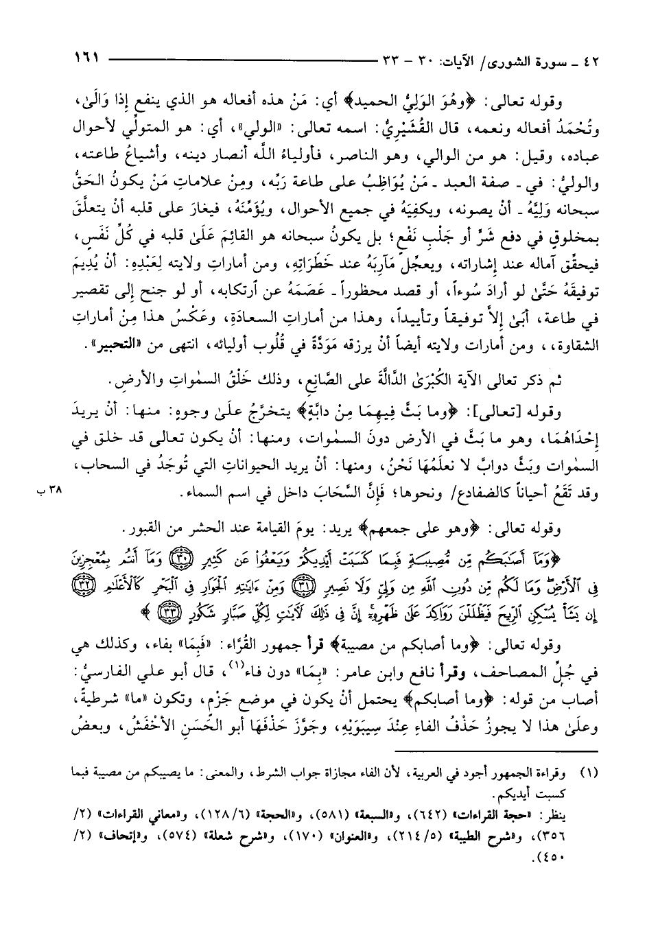 (1) وقراءة الجمهور أجود في العربية، لأن الفاء مجازاة جواب الشرط، والمعنى: ما يصيبكم من مصيبة فبما كسبت أيديكم.