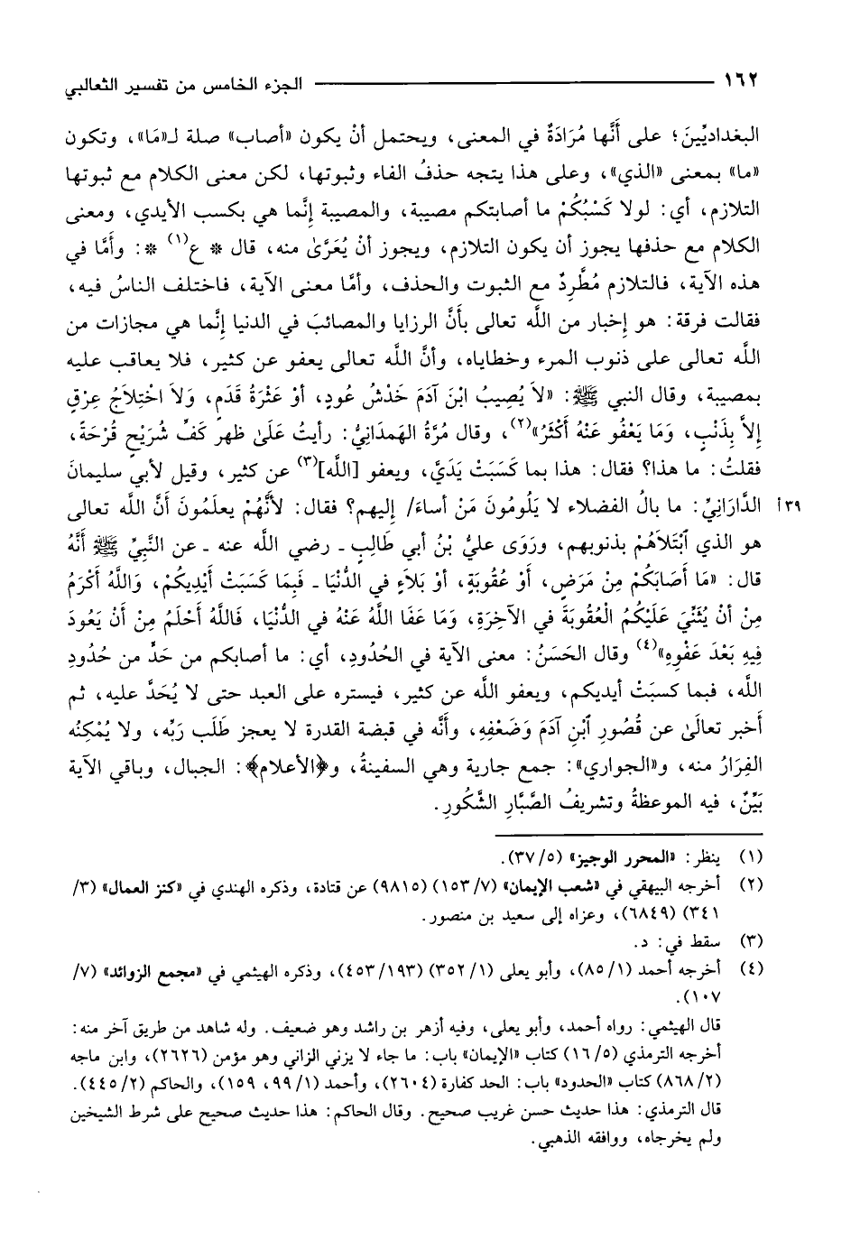 البغداديِّينَ على أَنَّها مُرَادَةٌ في المعنى، ويحتمل أنْ يكون «أصاب» صلة ل «مَا» ، وتكون «ما» بمعنى «الذي» ، وعلى هذا يتجه حذفُ الفاء وثبوتها، لكن معنى الكلام مع ثبوتها التلازم، أي: لولا كَسْبُكُمْ ما أصابتكم مصيبة، والمصيبة إنَّما هي بكسب الأيدي، ومعنى الكلام مع حذفها يجوز أن يكون التلازم، ويجوز أنْ يعرى منه، قال ع «1» : وأَمَّا في هذه الآية، فالتلازم مُطَّرِدٌ مع الثبوت والحذف، وأمَّا معنى الآية، فاختلف الناسُ فيه، فقالت فرقة: هو إخبار من اللَّه تعالى بأَنَّ الرزايا والمصائبَ في الدنيا إِنَّما هي مجازات من اللَّه تعالى على ذنوب المرء وخطاياه، وأنَّ اللَّه تعالى يعفو عن كثير، فلا يعاقب عليه بمصيبة، وقال النبي صلّى الله عليه وسلّم: «لاَ يُصِيبُ ابْنَ آدَمَ خَدْشُ عُودٍ، أوْ عَثْرَةُ قَدَمٍ، وَلاَ اخْتِلاَجُ عِرْقٍ إلاَّ بِذَنْبٍ، وَمَا يَعْفُو عَنْهُ أَكْثَرُ» «2» ، وقال مُرَّةُ الهَمَدَانِيُّ: رأيتُ على ظهر كَفِّ شُرَيْحٍ قُرْحَةً، فقلتُ: ما هذا؟ فقال: هذا بما كَسَبَتْ يَدَيَّ، ويعفو [اللَّه] «3» عن كثير، وقيل لأبي سليمانَ الدَّارَانِيِّ: ما بالُ الفضلاء لا يَلُومُونَ مَنْ أساءَ/ إليهم؟ فقال: لأَنَّهُمْ يعلَمُونَ أَنَّ اللَّه تعالى هو الذي ابتلاهم بذنوبهم، ورَوَى عليُّ بن أبي طالب- رضي الله عنه- عن النبيّ صلّى الله عليه وسلّم أَنَّهُ قال: «مَا أَصَابَكُمْ مِنْ مَرَضٍ، أَوْ عُقُوبَةٍ، أوْ بَلاَءٍ في الدُّنْيَا- فَبِمَا كَسَبَتْ أَيْدِيكُمْ، وَاللَّهُ أَكْرَمُ مِنْ أنْ يُثَنِّيَ عَلَيْكُمُ الْعُقُوبَةَ في الآخِرَةِ، وَمَا عَفَا اللَّهُ عَنْهُ في الدُّنْيَا، فَاللَّهُ أَحْلَمُ مِنْ أَنْ يَعُودَ فِيهِ بَعْدَ عَفْوِهِ» «4» وقال الحَسَنُ: معنى الآية في الحُدُودِ، أي: ما أصابكم من حَدٍّ من حُدُودِ اللَّه، فبما كسبَتْ أيديكم، ويعفو اللَّه عن كثير، فيستره على العبد حتى لا يُحَدَّ عليه، ثم أَخبر تعالى عن قُصُورِ ابن آدَمَ وَضَعْفِهِ، وأَنَّه في قبضة القدرة لا يعجز طَلَب رَبِّه، ولا يُمْكِنُه الفِرَارُ منه، و «الجواري» : جمع جارية وهي السفينة، وكَالْأَعْلامِ: الجبال، وباقي الآية بَيِّنٌ، فيه الموعظةُ وتشريفُ الصبّار الشكور.