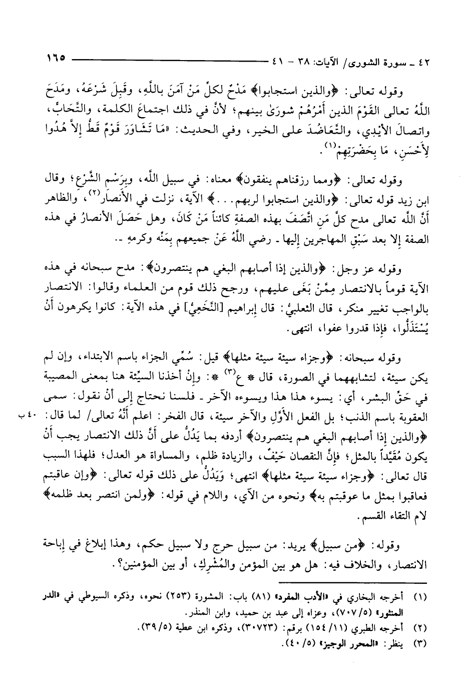 وقوله عز وجل: وَالَّذِينَ إِذا أَصابَهُمُ الْبَغْيُ هُمْ يَنْتَصِرُونَ: مدح سبحانه في هذه الآية قوماً بالانتصار مِمَّنْ بَغَى عليهم، ورجح ذلك قوم من العلماء وقالوا: الانتصار بالواجب تغيير منكر، قال الثعلبيُّ: قال إبراهيم [النَّخَعِيُّ] في هذه الآية: كانوا يكرهون أَنْ يُسْتَذَلُّوا، فإذا قدروا عفوا، انتهى.