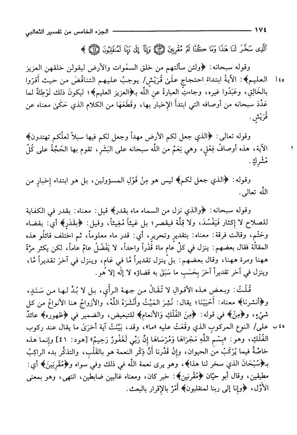 قُلْتُ: وبعض هذه الأقوالِ لا تُقَالُ من جهة الرأْيِ، بل لا بُدَّ لها من سَنَدٍ، وفَأَنْشَرْنا معناه: أَحْيَيْنَا يقال: نُشِرَ المَيِّتُ وأَنْشَرَهُ اللَّهُ، والأزواج هنا الأنواع من كلّ شيء، ومِنَ في قوله: مِنَ الْفُلْكِ وَالْأَنْعامِ للتبعيض، والضمير في ظُهُورِهِ عائدٌ على/ النوع المركوبِ الذي وقَعَتْ عليه «ما» ، وقد، بَيَّنَتْ آية أخرى ما يقال عند ركوب الفُلْكِ، وهو: «بِسْمِ الله مَجْرَاهَا وَمُرْسَاهَا إِنَّ رَبِّي لَغَفُورٌ رَّحِيمٌ» [هود: 41] وإنما هذه خاصَّةٌ فيما يُرْكَبُ من الحيوان، وإنْ قَدَّرنا أَنَّ ذِكْر النعمة هو بالقَلْبِ، والتذكُّر بدء الراكِبُ ب سُبْحانَ الَّذِي سَخَّرَ لَنا هذا، وهو يرى نعمة اللَّه في ذلك وفي سواه ومُقْرِنِينَ أي: