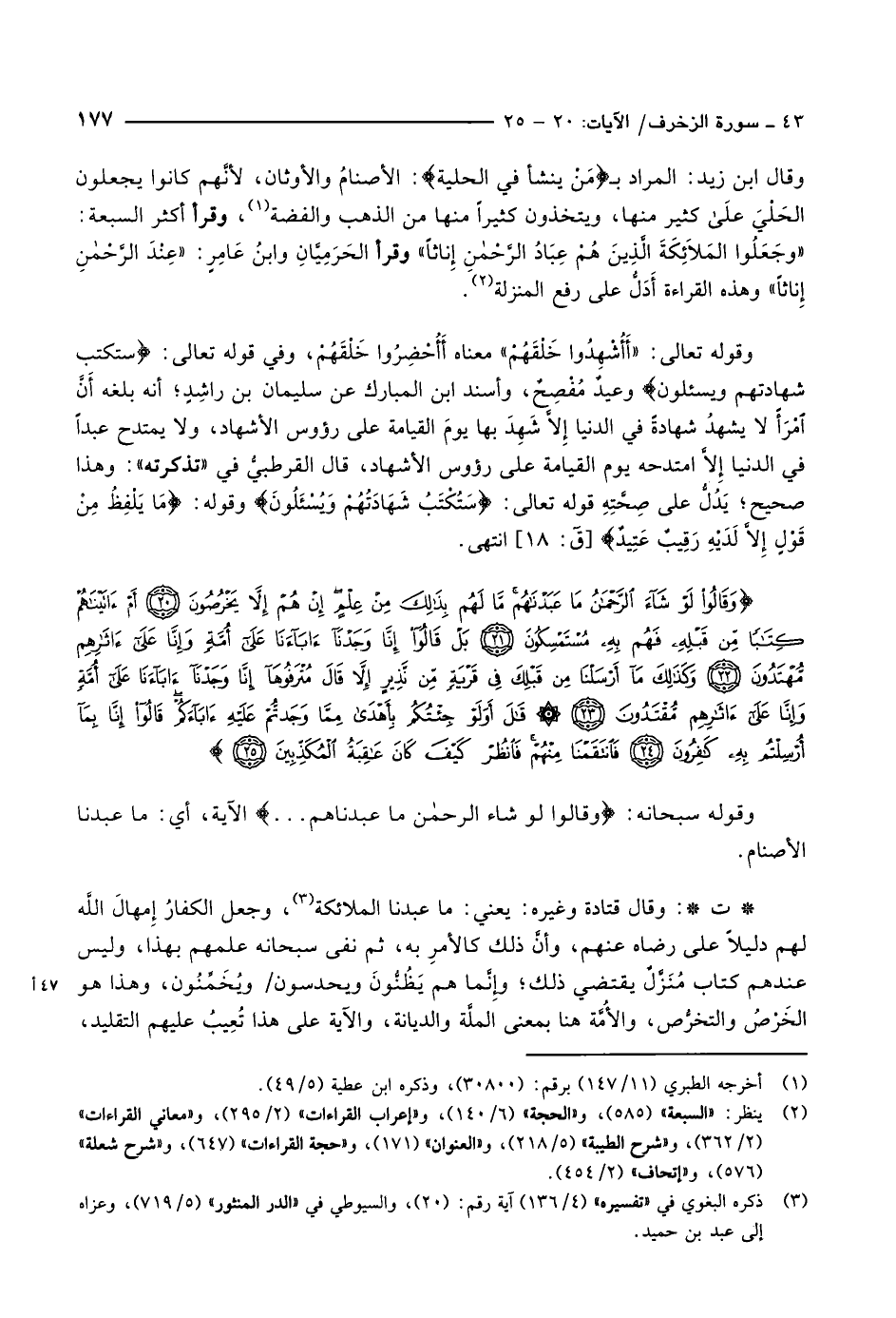 وَجَعَلُوا الْمَلائِكَةَ الَّذِينَ هُمْ عِبادُ الرَّحْمنِ إِناثاً وقرأ الحَرَمِيَّانِ وابنُ عَامِرٍ: «عِنْدَ الرحمن إناثاً» وهذه القراءة أَدَلُّ على رفع المنزلة «2» .