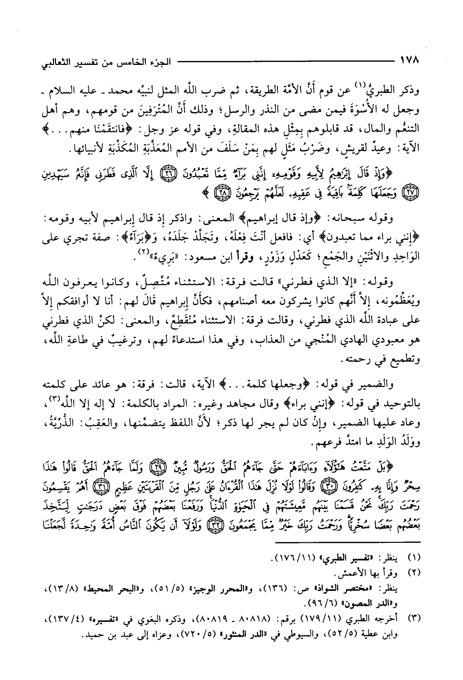 وَإِذْ قالَ إِبْراهِيمُ لِأَبِيهِ وَقَوْمِهِ إِنَّنِي بَراءٌ مِمَّا تَعْبُدُونَ (26) إِلاَّ الَّذِي فَطَرَنِي فَإِنَّهُ سَيَهْدِينِ (27) وَجَعَلَها كَلِمَةً باقِيَةً فِي عَقِبِهِ لَعَلَّهُمْ يَرْجِعُونَ (28)