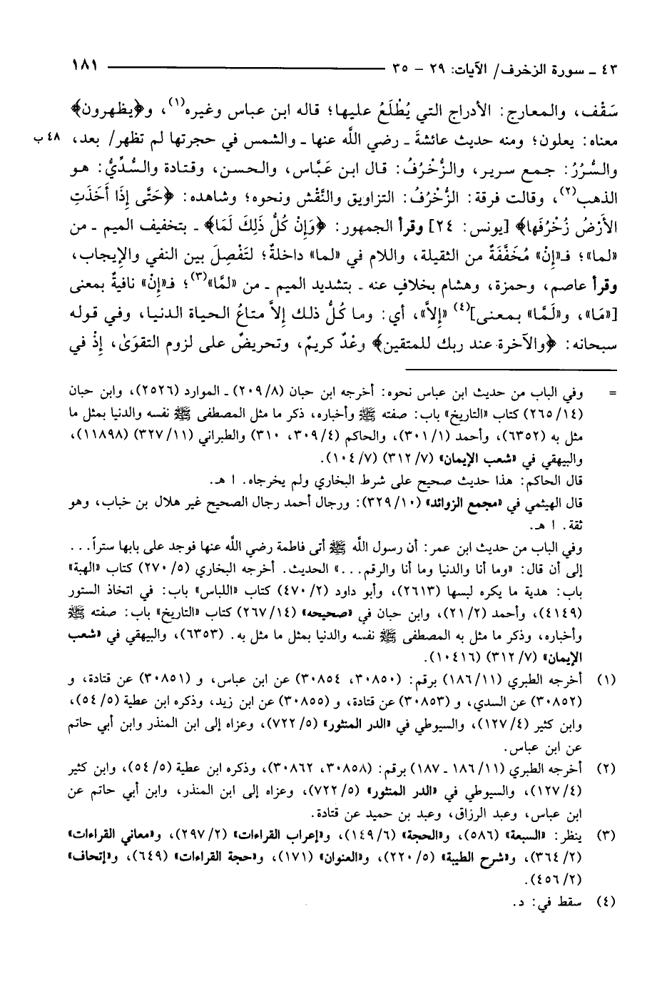 سَقْف، والمعارج: الأدراج التي يُطْلَعُ عليها قاله ابن عبّاس وغيره «1» ، ويَظْهَرُونَ معناه: يعلون ومنه حديث عائشةَ- رضي اللَّه عنها- والشمس في حجرتها لم تظهر/ بعد، والسُّرُرُ: جمع سرير، والزُّخْرُفُ: قال ابن عَبَّاس، والحسن، وقتادة والسُّدِّيُّ: هو الذهب «2» ، وقالت فرقة: الزُّخْرُفُ: التزاويق والنَّقْش ونحوه وشاهده: حَتَّى إِذا أَخَذَتِ الْأَرْضُ زُخْرُفَها [يونس: 24] وقرأ الجمهور: وَإِنْ كُلُّ ذلِكَ لَمَّا- بتخفيف الميم- من «لما» ف «إنْ» مُخَفَّفَةٌ من الثقيلة، واللام في «لما» داخلةٌ لتَفْصِلَ بين النفي والإيجاب، وقرأ عاصم، وحمزة، وهشام بخلافٍ عنه- بتشديد الميم- من «لمَّا» «3» ف «إنْ» نافيةٌ بمعنى [ «مَا» ، و «لَمَّا» بمعنى] «4» «إلاَّ» ، أي: وما كُلُّ ذلك إلاَّ متاعُ الحياة الدنيا، وفي قوله سبحانه: وَالْآخِرَةُ عِنْدَ رَبِّكَ لِلْمُتَّقِينَ وعْدٌ كريمٌ، وتحريض على لزوم التقوى، إذ في
