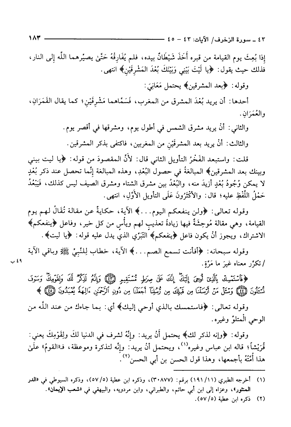 قلت: واستبعد الفَخْرُ التأويل الثاني قال: لأنّ المقصود من قوله: يا لَيْتَ بَيْنِي وَبَيْنَكَ بُعْدَ الْمَشْرِقَيْنِ المبالغةُ في حصول البُعْدِ، وهذه المبالغة إنَّما تحصل عند ذكر بُعْدٍ لا يمكن وُجُودُ بُعْدٍ أزيدَ منه، والبُعْدُ بين مشرق الشتاء ومشرق الصيف ليس كذلك، فَيَبْعُدُ حَمْلُ اللَّفْظِ عليه قال: والأكْثَرُونَ عَلَى التأويل الأَوَّلِ، انتهى.