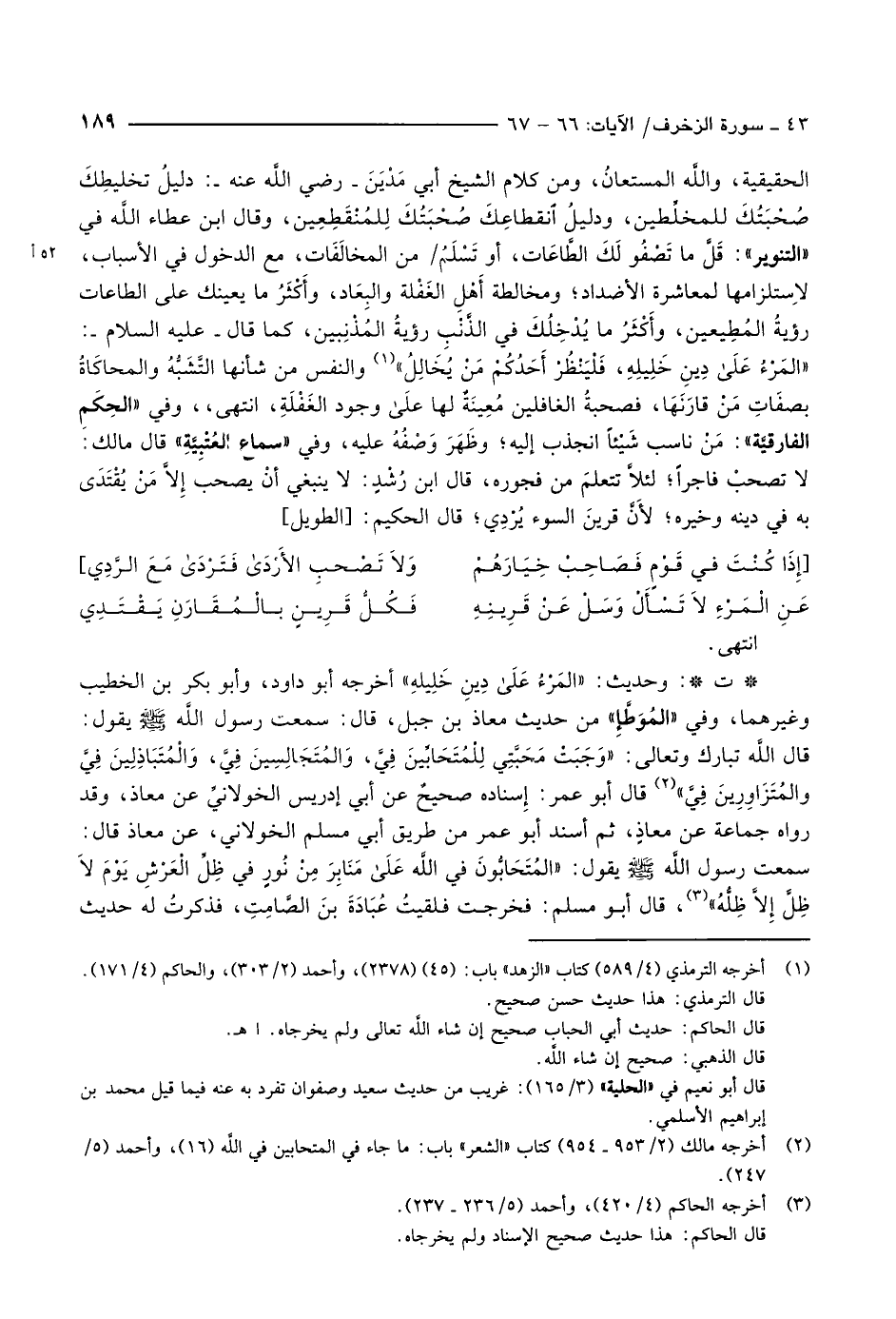 ت: وحديث: «المَرْءُ على دِينِ خَلِيلهِ» أخرجه أبو داود، وأبو بكر بن الخطيب وغيرهما، وفي «المُوَطَّإ» من حديث معاذ بن جبل، قال: سمعت رسول الله صلّى الله عليه وسلّم يقول: