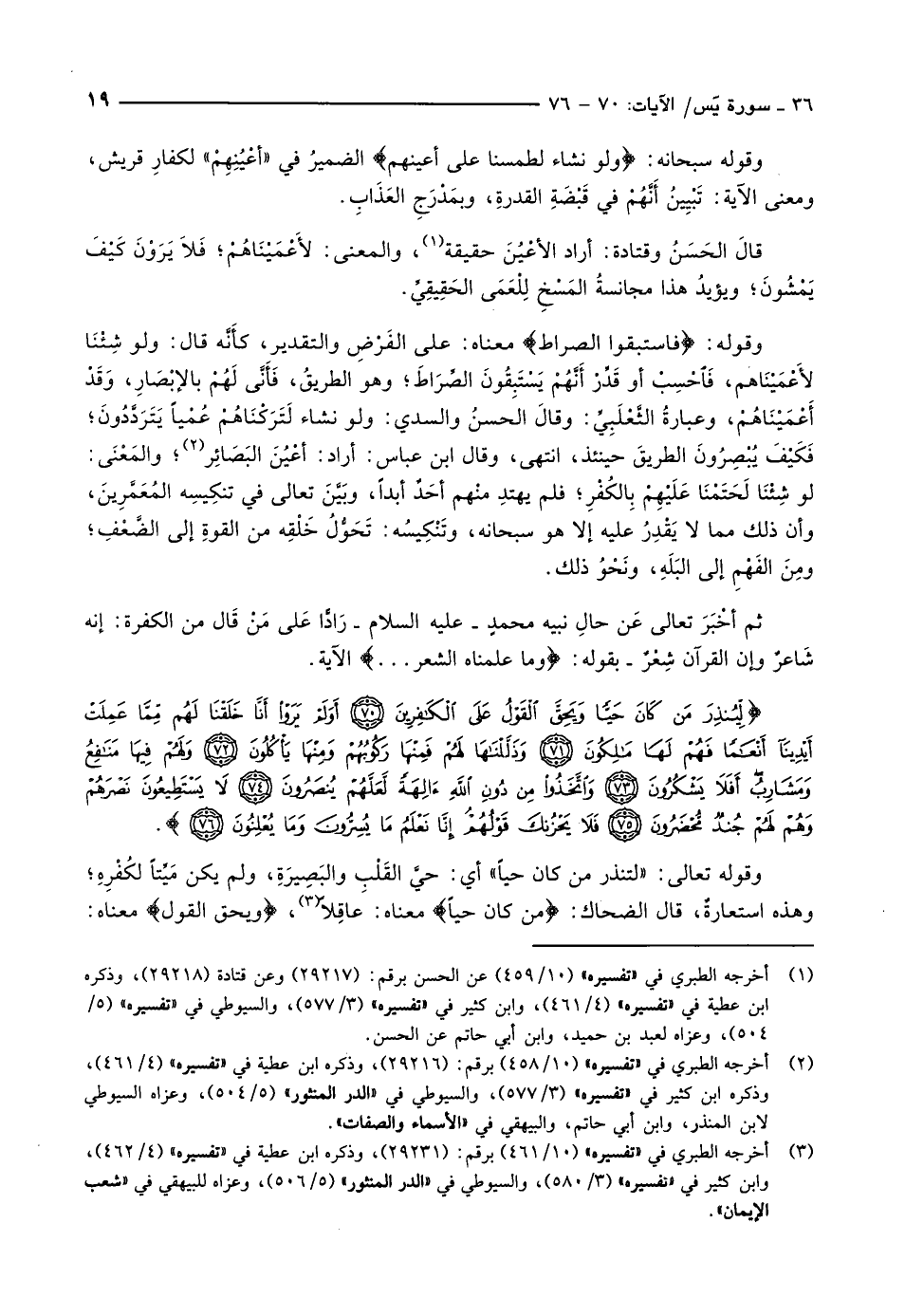 وقوله تعالى: «لتنذر مَن كَانَ حَيّاً» أي: حيَّ القَلْبِ والبَصِيرَةِ، ولم يكن مَيِّتاً لكُفْرِهِ وهذه استعارةٌ، قال الضحاك: مَنْ كانَ حَيًّا معناه: عاقِلاً «3» ، وَيَحِقَّ الْقَوْلُ معناه: