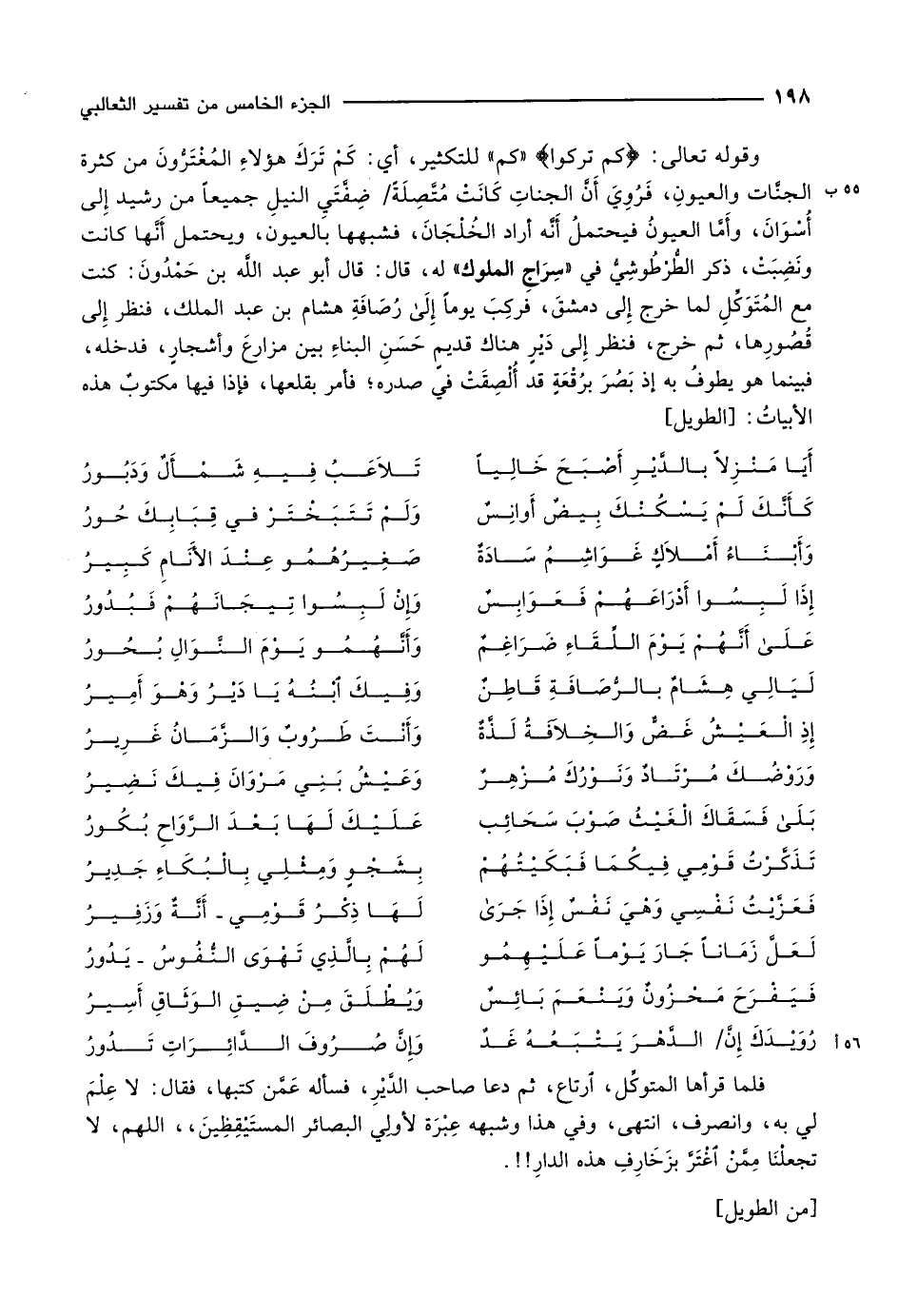 وقوله تعالى: كَمْ تَرَكُوا «كم» للتكثير، أي: كَمْ تَرَكَ هؤلاءِ المُغْتَرُّونَ من كثرة الجنَّات والعيونِ، فَرُوِيَ أَنَّ الجناتِ كَانَتْ مُتَّصِلَةً/ ضِفَّتَيِ النيلِ جميعاً من رشيد إلى أُسْوَانَ، وأَمَّا العيونُ فيحتملُ أَنَّه أراد الخُلْجَانَ، فشبهها بالعيون، ويحتمل أَنَّها كانت ونَضِبَتْ، ذكر الطُّرْطُوشِيُّ في «سِرَاجِ الملوك» له، قال: قال أبو عبد اللَّه بن حَمْدُونَ: كنت مع المُتَوَكِّلِ لما خرج إلى دمشقَ، فركِبَ يوماً إلى رُصَافَةِ هشام بن عبد الملك، فنظر إلى قُصُورِها، ثم خرج، فنظر إلى دَيْرٍ هناك قديمٍ حَسَنِ البناءِ بين مزارعَ وأشجارٍ، فدخله، فبينما هو يطوفُ به إذ بَصُرَ برُقْعَةٍ قد أُلْصِقَتْ في صدره فأمر بقلعها، فإذا فيها مكتوبٌ هذه الأبياتُ: [الطويل]