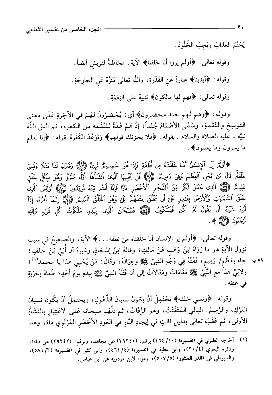 أَوَلَمْ يَرَ الْإِنْسانُ أَنَّا خَلَقْناهُ مِنْ نُطْفَةٍ فَإِذا هُوَ خَصِيمٌ مُبِينٌ (77) وَضَرَبَ لَنا مَثَلاً وَنَسِيَ خَلْقَهُ قالَ مَنْ يُحْيِ الْعِظامَ وَهِيَ رَمِيمٌ (78) قُلْ يُحْيِيهَا الَّذِي أَنْشَأَها أَوَّلَ مَرَّةٍ وَهُوَ بِكُلِّ خَلْقٍ عَلِيمٌ (79) الَّذِي جَعَلَ لَكُمْ مِنَ الشَّجَرِ الْأَخْضَرِ ناراً فَإِذا أَنْتُمْ مِنْهُ تُوقِدُونَ (80) أَوَلَيْسَ الَّذِي خَلَقَ السَّماواتِ وَالْأَرْضَ بِقادِرٍ عَلى أَنْ يَخْلُقَ مِثْلَهُمْ بَلى وَهُوَ الْخَلاَّقُ الْعَلِيمُ (81)