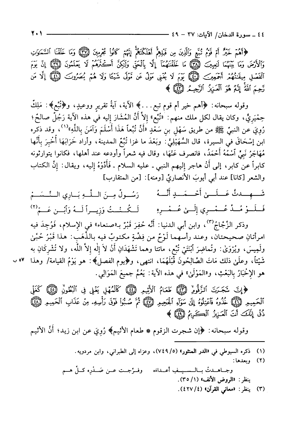 وقوله سبحانه: أَهُمْ خَيْرٌ أَمْ قَوْمُ تُبَّعٍ ... الآية، آية تقرير ووعيد، وتُبَّعٍ: مَلِكٌ حِمْيَرِيٌّ، وكان يقال لكل ملك منهم: «تُبَّع» إلاَّ أَنَّ المُشَارَ إليه في هذه الآية رجل صالح روي عن النبيّ صلّى الله عليه وسلّم من طريق سَهْلِ بنِ سَعْدٍ «أَنَّ تُبَّعاً هَذَا أَسْلَمَ وَآمَنَ بِاللَّهِ» «1» ، وقد ذكره ابن إسْحَاقَ في السيرة، قال السُّهَيْلِيُّ: وبَعْدَ ما غزا تُبَّعٌ المدينة، وأراد خَرَابَهَا أُخْبِرَ بِأَنَّها مُهَاجَرُ نَبِيٍّ اسمه أَحْمَدُ، فانصرف عَنْهَا، وقال فيه شعراً وأودعه عند أهلها، فكانوا يتوارثونه كابراً عن كابر، إلى أَنْ هاجر إليهم النبي ع فَأَدَّوْهُ إليه، ويقال: إنَّ الكتاب والشعر [كانا] عند أبي أيوبَ الأنصاريِّ [ومنه] : [من المتقارب]
