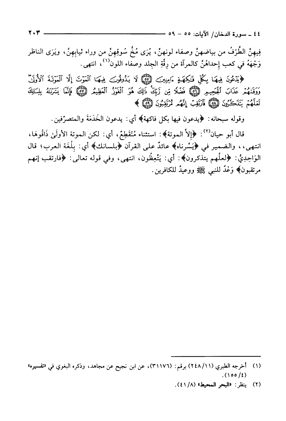قال أبو حيان «2» : إِلَّا الْمَوْتَةَ: استثناء مُنْقَطِعٌ، أي: لكن الموتة الأولى ذَاقُوهَا، انتهى،، والضمير في يَسَّرْناهُ عائدٌ على القرآن بِلِسانِكَ أي: بِلُغَة العرب قال الوَاحِدِيُّ: لَعَلَّهُمْ يَتَذَكَّرُونَ: أي: يَتَّعِظُون، انتهى، وفي قوله تعالى: فَارْتَقِبْ إِنَّهُمْ مُرْتَقِبُونَ وعد للنبي صلّى الله عليه وسلّم ووعيد للكافرين.