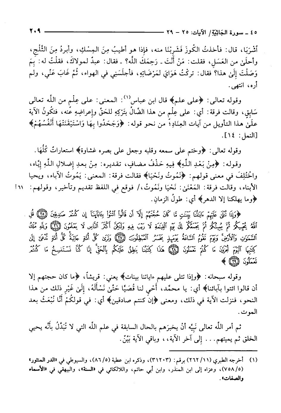 وَإِذا تُتْلى عَلَيْهِمْ آياتُنا بَيِّناتٍ مَّا كانَ حُجَّتَهُمْ إِلاَّ أَنْ قالُوا ائْتُوا بِآبائِنا إِنْ كُنْتُمْ صادِقِينَ (25) قُلِ اللَّهُ يُحْيِيكُمْ ثُمَّ يُمِيتُكُمْ ثُمَّ يَجْمَعُكُمْ إِلى يَوْمِ الْقِيامَةِ لا رَيْبَ فِيهِ وَلكِنَّ أَكْثَرَ النَّاسِ لا يَعْلَمُونَ (26) وَلِلَّهِ مُلْكُ السَّماواتِ وَالْأَرْضِ وَيَوْمَ تَقُومُ السَّاعَةُ يَوْمَئِذٍ يَخْسَرُ الْمُبْطِلُونَ (27) وَتَرى كُلَّ أُمَّةٍ جاثِيَةً كُلُّ أُمَّةٍ تُدْعى إِلى كِتابِهَا الْيَوْمَ تُجْزَوْنَ ما كُنْتُمْ تَعْمَلُونَ (28) هذا كِتابُنا يَنْطِقُ عَلَيْكُمْ بِالْحَقِّ إِنَّا كُنَّا نَسْتَنْسِخُ ما كُنْتُمْ تَعْمَلُونَ (29)