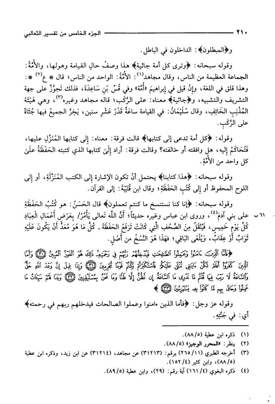 وقوله: كُلُّ أُمَّةٍ تُدْعى إِلى كِتابِهَا قالت فرقة: معناه: إلى كتابها المنزّل عليها، فتحاكم إِليه، هل وافقته أو خالفته؟ وقالت فرقة: أراد إلى كتابها الذي كتبته الحَفَظَةُ على كل واحد من الأُمَّةِ.