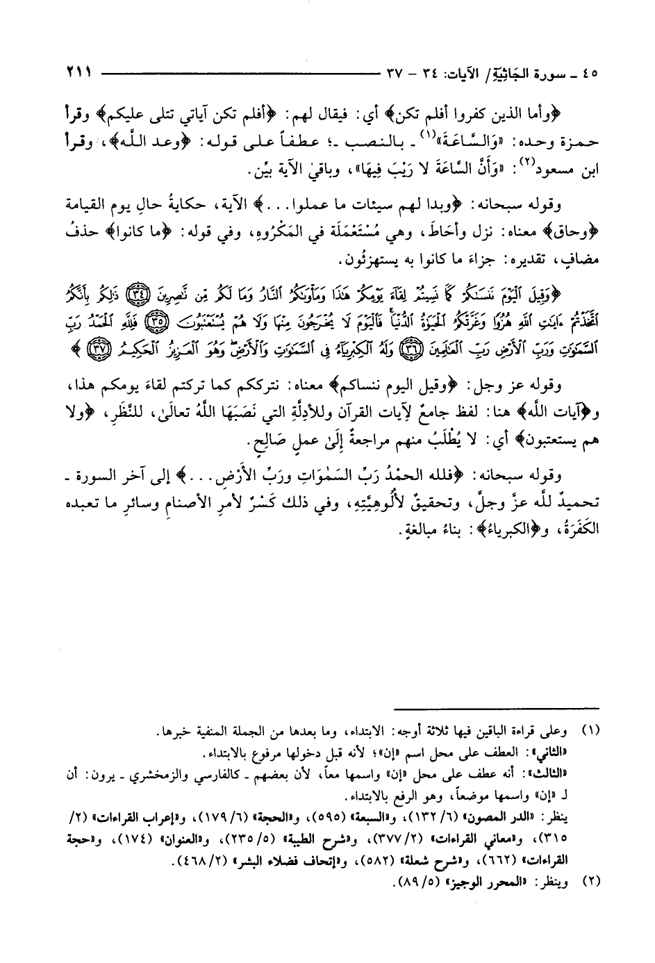 وَقِيلَ الْيَوْمَ نَنْساكُمْ كَما نَسِيتُمْ لِقاءَ يَوْمِكُمْ هذا وَمَأْواكُمُ النَّارُ وَما لَكُمْ مِنْ ناصِرِينَ (34) ذلِكُمْ بِأَنَّكُمُ اتَّخَذْتُمْ آياتِ اللَّهِ هُزُواً وَغَرَّتْكُمُ الْحَياةُ الدُّنْيا فَالْيَوْمَ لا يُخْرَجُونَ مِنْها وَلا هُمْ يُسْتَعْتَبُونَ (35) فَلِلَّهِ الْحَمْدُ رَبِّ السَّماواتِ وَرَبِّ الْأَرْضِ رَبِّ الْعالَمِينَ (36) وَلَهُ الْكِبْرِياءُ فِي السَّماواتِ وَالْأَرْضِ وَهُوَ الْعَزِيزُ الْحَكِيمُ (37)