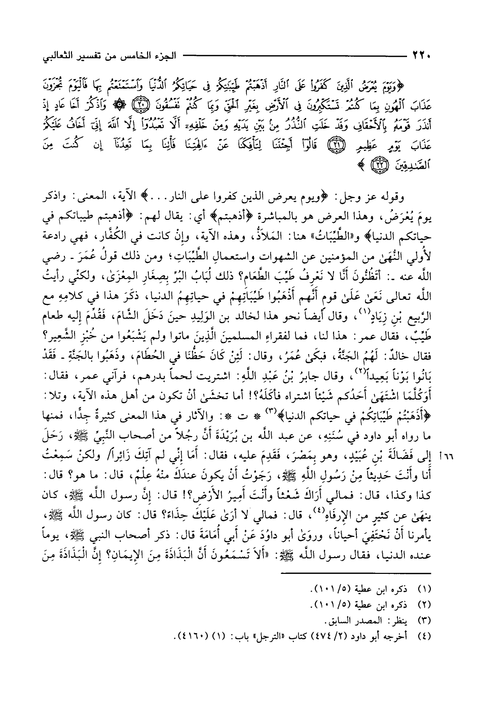 وقوله عز وجل: وَيَوْمَ يُعْرَضُ الَّذِينَ كَفَرُوا عَلَى النَّارِ ... الآية، المعنى: واذكر يومَ يُعْرَضُ، وهذا العرض هو بالمباشرة أَذْهَبْتُمْ أي: يقال لهم: أَذْهَبْتُمْ طَيِّباتِكُمْ فِي حَياتِكُمُ الدُّنْيا و «الطَّيِّبَاتُ» هنا: المَلاَذُّ، وهذه الآية، وإنْ كانت في الكُفَّار، فهي رادعة لأُولي النهى من المؤمنين عن الشهوات واستعمالِ الطَّيِّبَاتِ ومن ذلك قولُ عُمَرَ- رضي اللَّه عنه-: أتَظُنُّونَ أَنَّا لا نَعْرِفُ طَيِّبَ الطَّعَامِ؟ ذلك لُبَابُ البُرِّ بِصِغَارِ المعزى، ولكنِّي رأيتُ اللَّه تعالى نعى على قومٍ أَنَّهم أَذْهَبُوا طَيِّبَاتِهِمْ في حياتِهِمُ الدنيا، ذكَرَ هذا في كلامِهِ مع الرَّبيع بْنِ زِيَادٍ «1» ، وقال أيضاً نحو هذا لخالد بن الوَلِيدِ حينَ دَخَلَ الشَّامَ، فَقُدِّمَ إليه طعام طَيِّبٌ، فقال عمر: هذا لنا، فما لفقراءِ المسلمينَ الَّذِينَ ماتوا ولم يَشْبَعُوا من خُبْزِ الشَّعِير؟