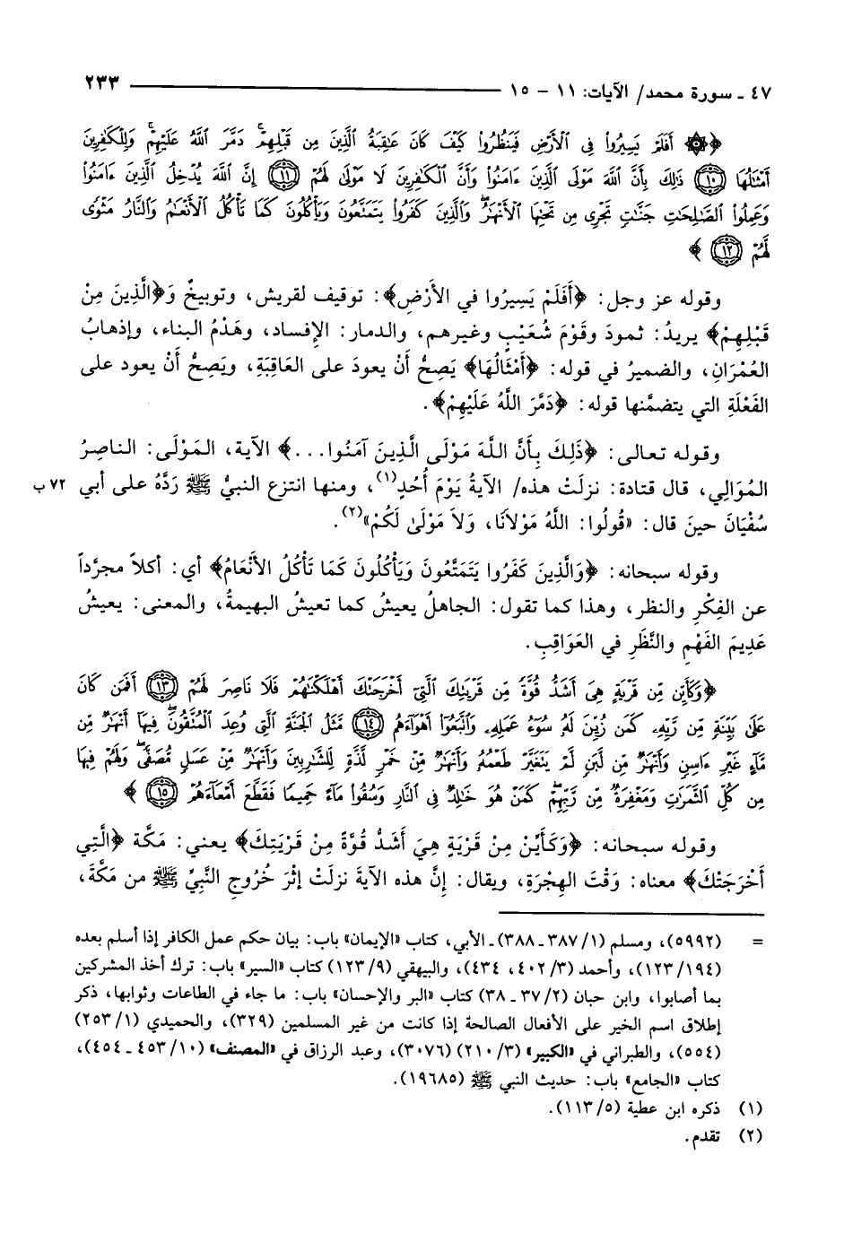 أَفَلَمْ يَسِيرُوا فِي الْأَرْضِ فَيَنْظُرُوا كَيْفَ كانَ عاقِبَةُ الَّذِينَ مِنْ قَبْلِهِمْ دَمَّرَ اللَّهُ عَلَيْهِمْ وَلِلْكافِرِينَ أَمْثالُها (10) ذلِكَ بِأَنَّ اللَّهَ مَوْلَى الَّذِينَ آمَنُوا وَأَنَّ الْكافِرِينَ لا مَوْلى لَهُمْ (11) إِنَّ اللَّهَ يُدْخِلُ الَّذِينَ آمَنُوا وَعَمِلُوا الصَّالِحاتِ جَنَّاتٍ تَجْرِي مِنْ تَحْتِهَا الْأَنْهارُ وَالَّذِينَ كَفَرُوا يَتَمَتَّعُونَ وَيَأْكُلُونَ كَما تَأْكُلُ الْأَنْعامُ وَالنَّارُ مَثْوىً لَهُمْ (12)