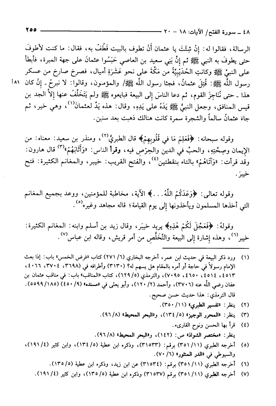 (1) ورد ذكر البيعة في حديث ابن عمر، أخرجه البخاري (6/ 271) كتاب «فرض الخمس» باب: إذا بعث الإمام رسولا في حاجة أو أمره بالمقام هل يسهم له؟ (3130) وأطرافه في (3698، 3704، 4066، 4513، 4514، 4650، 7095) ، والترمذي (5/ 629) ، كتاب «المناقب» باب: في مناقب عثمان بن عفان رضي الله عنه (3706) ، وأحمد (2/ 120) ، وأبو يعلى في «مسنده» (9/ 450) (185/ 5599) .