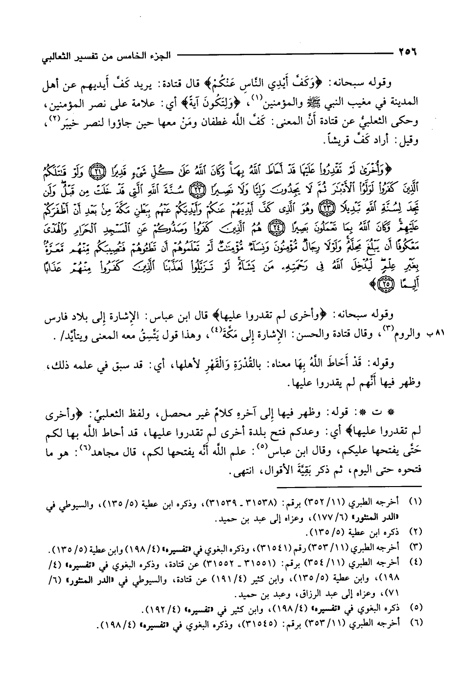 وَأُخْرى لَمْ تَقْدِرُوا عَلَيْها قَدْ أَحاطَ اللَّهُ بِها وَكانَ اللَّهُ عَلى كُلِّ شَيْءٍ قَدِيراً (21) وَلَوْ قاتَلَكُمُ الَّذِينَ كَفَرُوا لَوَلَّوُا الْأَدْبارَ ثُمَّ لاَ يَجِدُونَ وَلِيًّا وَلا نَصِيراً (22) سُنَّةَ اللَّهِ الَّتِي قَدْ خَلَتْ مِنْ قَبْلُ وَلَنْ تَجِدَ لِسُنَّةِ اللَّهِ تَبْدِيلاً (23) وَهُوَ الَّذِي كَفَّ أَيْدِيَهُمْ عَنْكُمْ وَأَيْدِيَكُمْ عَنْهُمْ بِبَطْنِ مَكَّةَ مِنْ بَعْدِ أَنْ أَظْفَرَكُمْ عَلَيْهِمْ وَكانَ اللَّهُ بِما تَعْمَلُونَ بَصِيراً (24) هُمُ الَّذِينَ كَفَرُوا وَصَدُّوكُمْ عَنِ الْمَسْجِدِ الْحَرامِ وَالْهَدْيَ مَعْكُوفاً أَنْ يَبْلُغَ مَحِلَّهُ وَلَوْلا رِجالٌ مُؤْمِنُونَ وَنِساءٌ مُؤْمِناتٌ لَمْ تَعْلَمُوهُمْ أَنْ تَطَؤُهُمْ فَتُصِيبَكُمْ مِنْهُمْ مَعَرَّةٌ بِغَيْرِ عِلْمٍ لِيُدْخِلَ اللَّهُ فِي رَحْمَتِهِ مَنْ يَشاءُ لَوْ تَزَيَّلُوا لَعَذَّبْنَا الَّذِينَ كَفَرُوا مِنْهُمْ عَذاباً أَلِيماً (25)