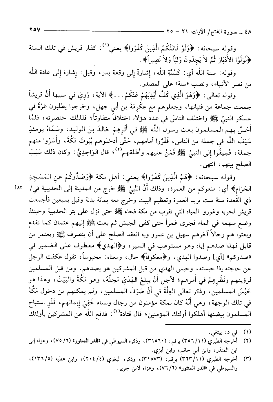 وقوله سبحانه: وَلَوْ قاتَلَكُمُ الَّذِينَ كَفَرُوا يعني «1» : كفار قريش في تلك السنة لَوَلَّوُا الْأَدْبارَ ثُمَّ لاَ يَجِدُونَ وَلِيًّا وَلا نَصِيراً.