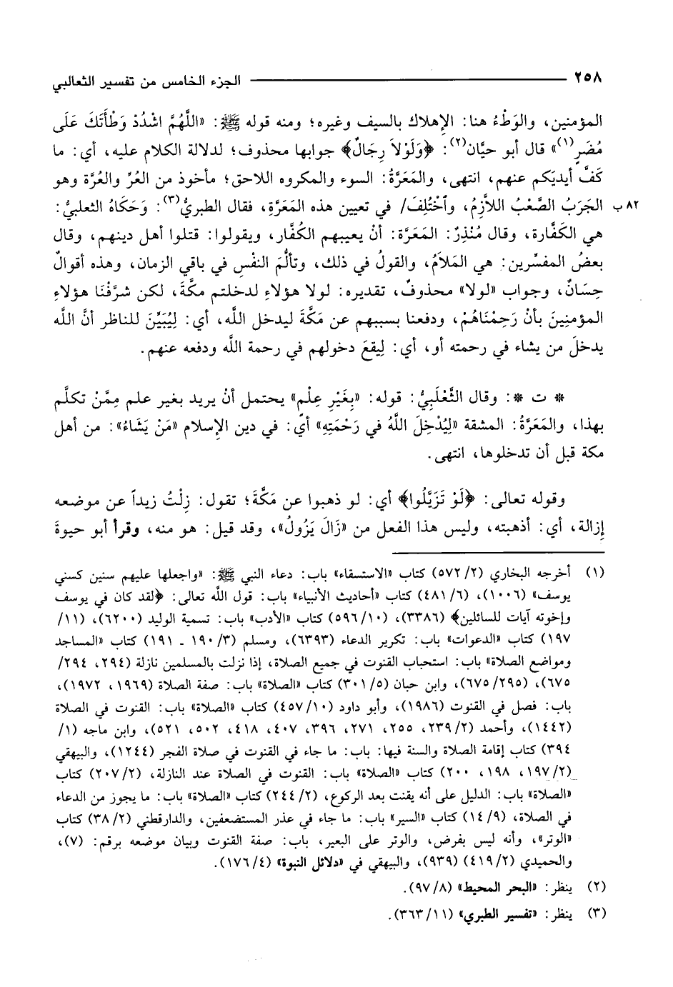 ت: وقال الثَّعْلَبِيُّ: قوله: «بِغَيْرِ عِلْمٍ» يحتمل أنْ يريد بغير علم مِمَّنْ تكلَّم بهذا، والمَعَرَّةُ: المشقة «لِيُدْخِلَ اللَّهُ في رَحْمَتِهِ» أي: في دين الإِسلام «مَنْ يَشَاءُ» : من أهل مكة قبل أن تدخلوها، انتهى.