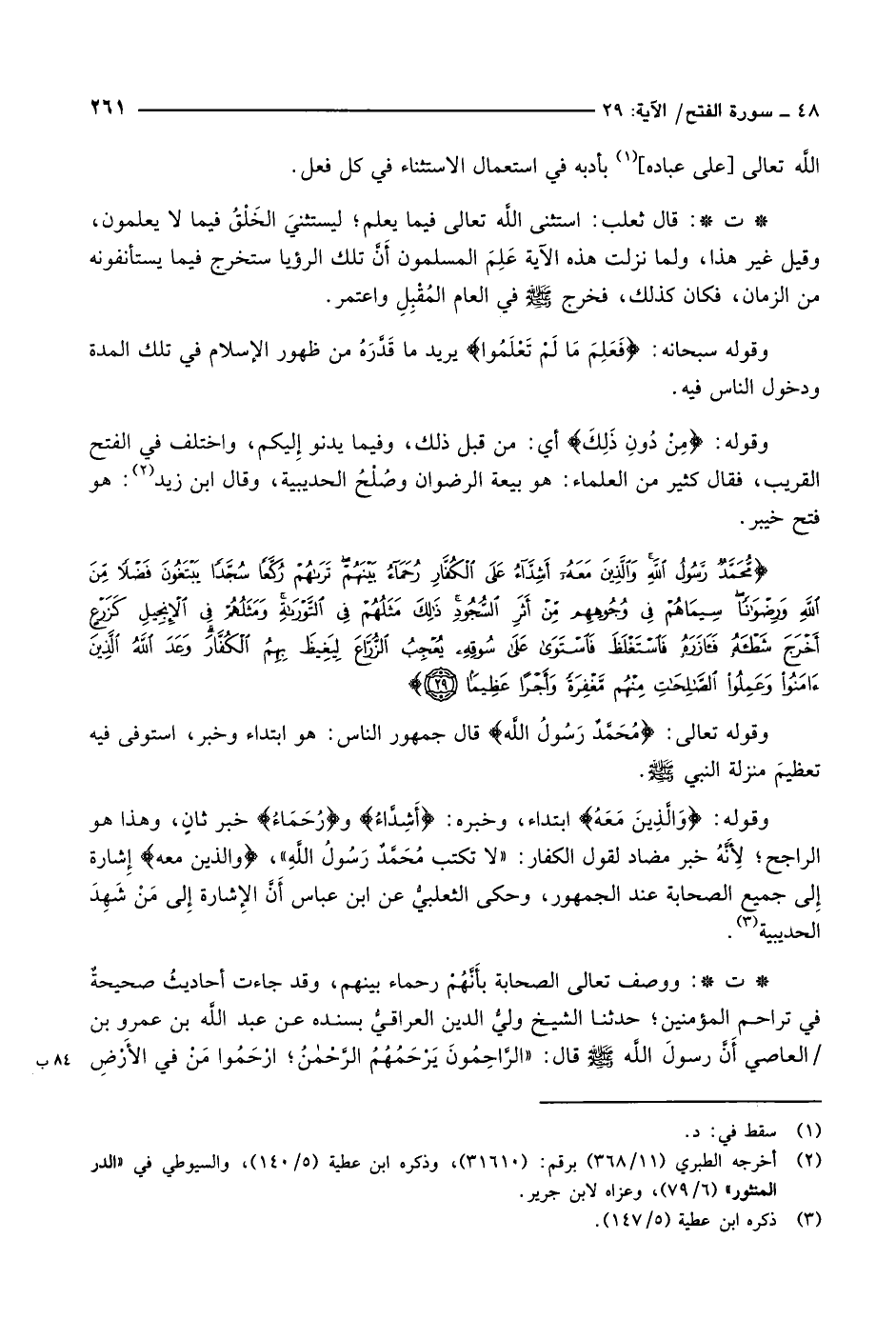 ت: ووصف تعالى الصحابة بأَنَّهُمْ رحماء بينهم، وقد جاءت أحاديثُ صحيحةٌ في تراحم المؤمنين حدثنا الشيخ وليُّ الدين العراقيُّ بسنده عن عبد اللَّه بن عمرو بن/ العاصي أَنَّ رسولَ الله صلّى الله عليه وسلّم قال: «الرَّاحِمُونَ يَرْحَمُهُمُ الرحمن ارْحَمُوا مَنْ في الأرض