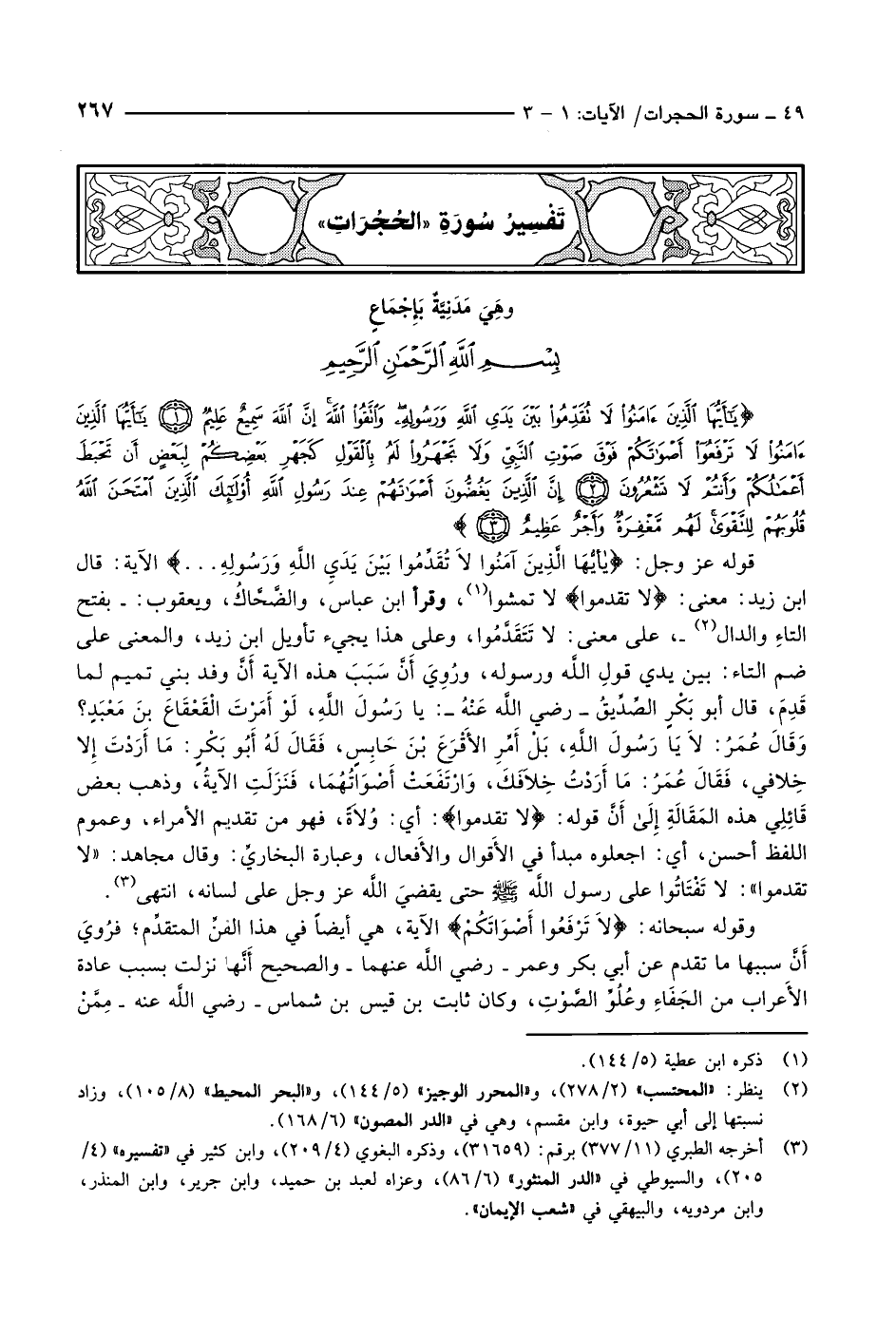 يا أَيُّهَا الَّذِينَ آمَنُوا لا تُقَدِّمُوا بَيْنَ يَدَيِ اللَّهِ وَرَسُولِهِ وَاتَّقُوا اللَّهَ إِنَّ اللَّهَ سَمِيعٌ عَلِيمٌ (1) يا أَيُّهَا الَّذِينَ آمَنُوا لا تَرْفَعُوا أَصْواتَكُمْ فَوْقَ صَوْتِ النَّبِيِّ وَلا تَجْهَرُوا لَهُ بِالْقَوْلِ كَجَهْرِ بَعْضِكُمْ لِبَعْضٍ أَنْ تَحْبَطَ أَعْمالُكُمْ وَأَنْتُمْ لا تَشْعُرُونَ (2) إِنَّ الَّذِينَ يَغُضُّونَ أَصْواتَهُمْ عِنْدَ رَسُولِ اللَّهِ أُولئِكَ الَّذِينَ امْتَحَنَ اللَّهُ قُلُوبَهُمْ لِلتَّقْوى لَهُمْ مَغْفِرَةٌ وَأَجْرٌ عَظِيمٌ (3)