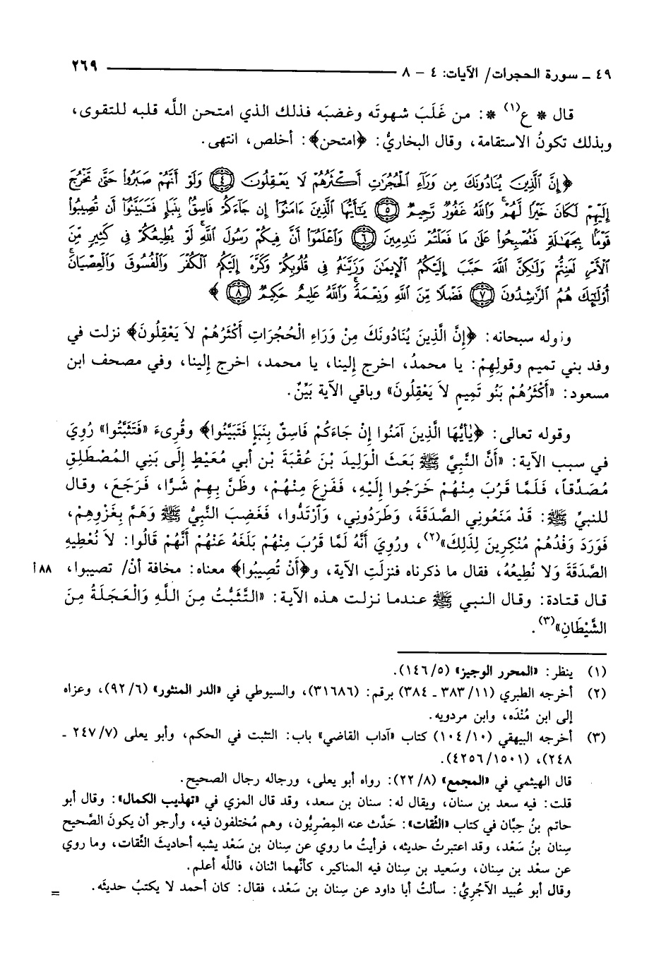 وقوله سبحانه: إِنَّ الَّذِينَ يُنادُونَكَ مِنْ وَراءِ الْحُجُراتِ أَكْثَرُهُمْ لاَ يَعْقِلُونَ نزلت في وفد بني تميم وقولِهِمْ: يا محمدُ، اخرج إلينا، يا محمد، اخرج إلينا، وفي مصحف ابن مسعود: «أَكْثَرُهُمْ بَنُو تَمِيمٍ لاَ يَعْقِلُونَ» وباقي الآية بيّن.