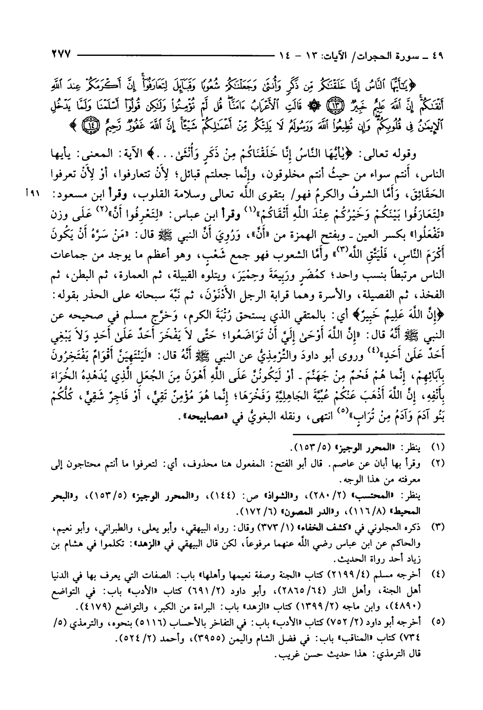 يا أَيُّهَا النَّاسُ إِنَّا خَلَقْناكُمْ مِنْ ذَكَرٍ وَأُنْثى وَجَعَلْناكُمْ شُعُوباً وَقَبائِلَ لِتَعارَفُوا إِنَّ أَكْرَمَكُمْ عِنْدَ اللَّهِ أَتْقاكُمْ إِنَّ اللَّهَ عَلِيمٌ خَبِيرٌ (13) قالَتِ الْأَعْرابُ آمَنَّا قُلْ لَمْ تُؤْمِنُوا وَلكِنْ قُولُوا أَسْلَمْنا وَلَمَّا يَدْخُلِ الْإِيمانُ فِي قُلُوبِكُمْ وَإِنْ تُطِيعُوا اللَّهَ وَرَسُولَهُ لا يَلِتْكُمْ مِنْ أَعْمالِكُمْ شَيْئاً إِنَّ اللَّهَ غَفُورٌ رَحِيمٌ (14)
