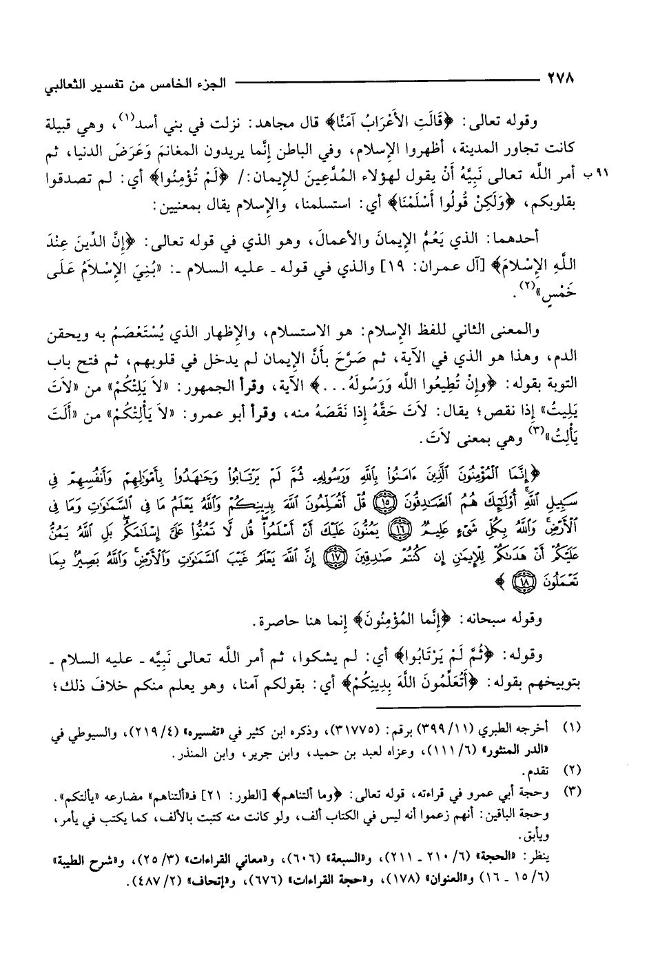 إِنَّمَا الْمُؤْمِنُونَ الَّذِينَ آمَنُوا بِاللَّهِ وَرَسُولِهِ ثُمَّ لَمْ يَرْتابُوا وَجاهَدُوا بِأَمْوالِهِمْ وَأَنْفُسِهِمْ فِي سَبِيلِ اللَّهِ أُولئِكَ هُمُ الصَّادِقُونَ (15) قُلْ أَتُعَلِّمُونَ اللَّهَ بِدِينِكُمْ وَاللَّهُ يَعْلَمُ ما فِي السَّماواتِ وَما فِي الْأَرْضِ وَاللَّهُ بِكُلِّ شَيْءٍ عَلِيمٌ (16) يَمُنُّونَ عَلَيْكَ أَنْ أَسْلَمُوا قُلْ لا تَمُنُّوا عَلَيَّ إِسْلامَكُمْ بَلِ اللَّهُ يَمُنُّ عَلَيْكُمْ أَنْ هَداكُمْ لِلْإِيمانِ إِنْ كُنْتُمْ صادِقِينَ (17) إِنَّ اللَّهَ يَعْلَمُ غَيْبَ السَّماواتِ وَالْأَرْضِ وَاللَّهُ بَصِيرٌ بِما تَعْمَلُونَ (18)