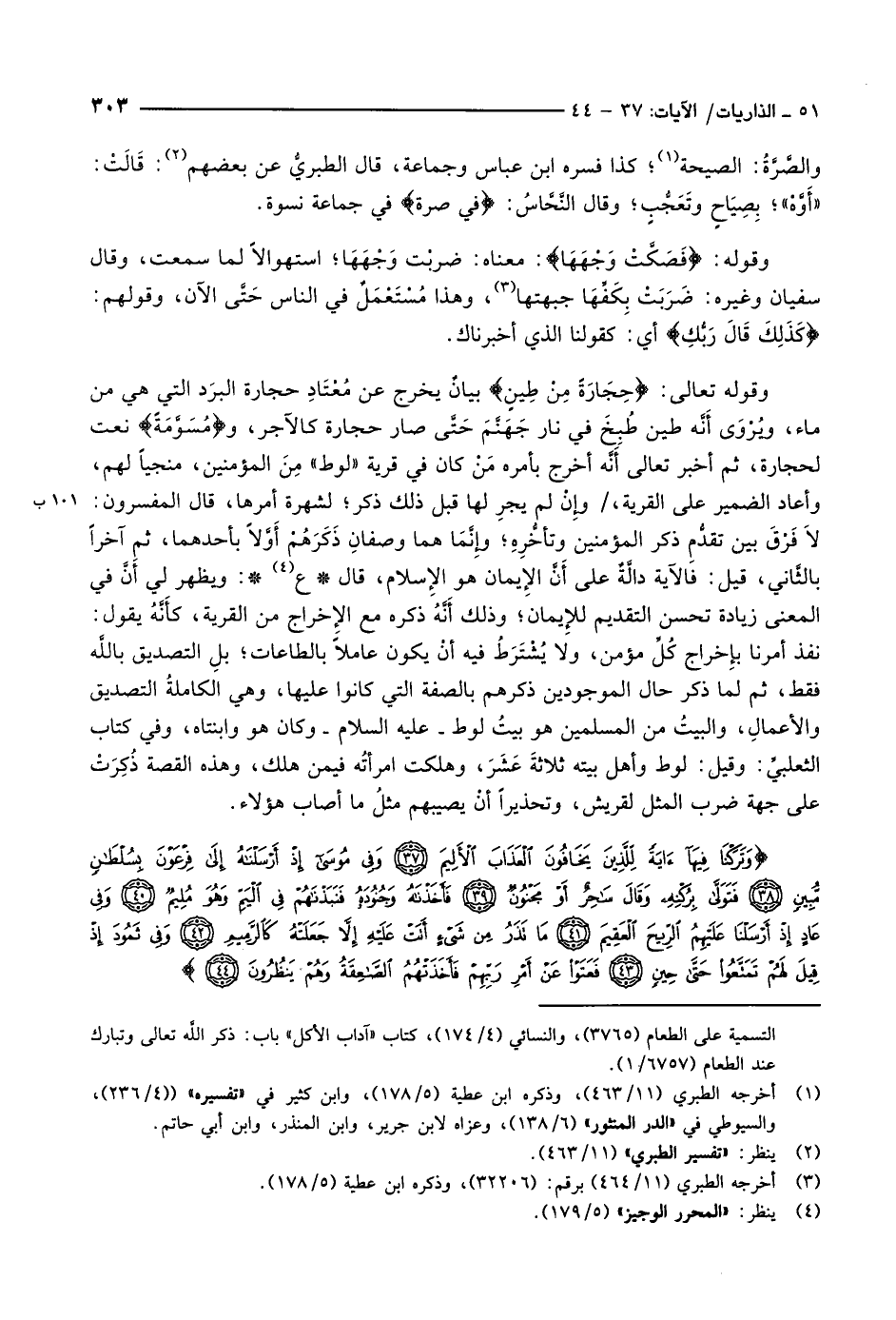 وقوله تعالى: حِجارَةً مِنْ طِينٍ بيانٌ يخرج عن مُعْتَادِ حجارة البرَد التي هي من ماء، ويُرْوَى أَنَّه طين طُبِخَ في نار جَهَنَّمَ حَتَّى صار حجارة كالآجر، ومُسَوَّمَةً نعت لحجارة، ثم أخبر تعالى أَنَّه أخرج بأمره مَنْ كان في قرية «لوط» مِنَ المؤمنين، منجياً لهم، وأعاد الضمير على القرية، / وإنْ لم يجرِ لها قبل ذلك ذكر لشهرة أمرها، قال المفسرون: