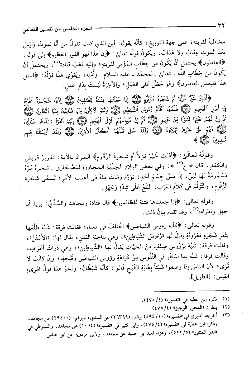 وقوله تعالى: كَأَنَّهُ رُؤُسُ الشَّياطِينِ اخْتَلَفَ في معناه فقالت فرقة: شَبَّهَ طَلْعَها بثَمَرِ شَجَرَةٍ مَعْرُوفَةٍ يقالُ لَها «رُءُوسُ الشَّيَاطِينِ» ، وهي بناحِيَةِ اليَمَنِ، يقال لها: «الأَسْتَنُ» ، وقالت فرقة: شَبَّهَ برُؤُوسِ صِنْفٍ منَ الحيَّاتِ يُقَالُ لها «الشَّياطِين» ، وهي ذواتُ أعْرَافٍ، وقالت فرقة: شَبَّه بما اسْتَقَر في النُّفُوسِ مِنْ كَرَاهَةِ رؤوس الشياطين وقُبْحِهَا وإنْ كانَتْ لاَ تُرَى لأن الناسَ إذا وصفوا شَيْئاً بِغَايَةِ القُبْحِ قَالوا: كأنَّه شَيْطَانٌ ونَحوُ هذا قولُ امرئ القيس: [الطويل] .
