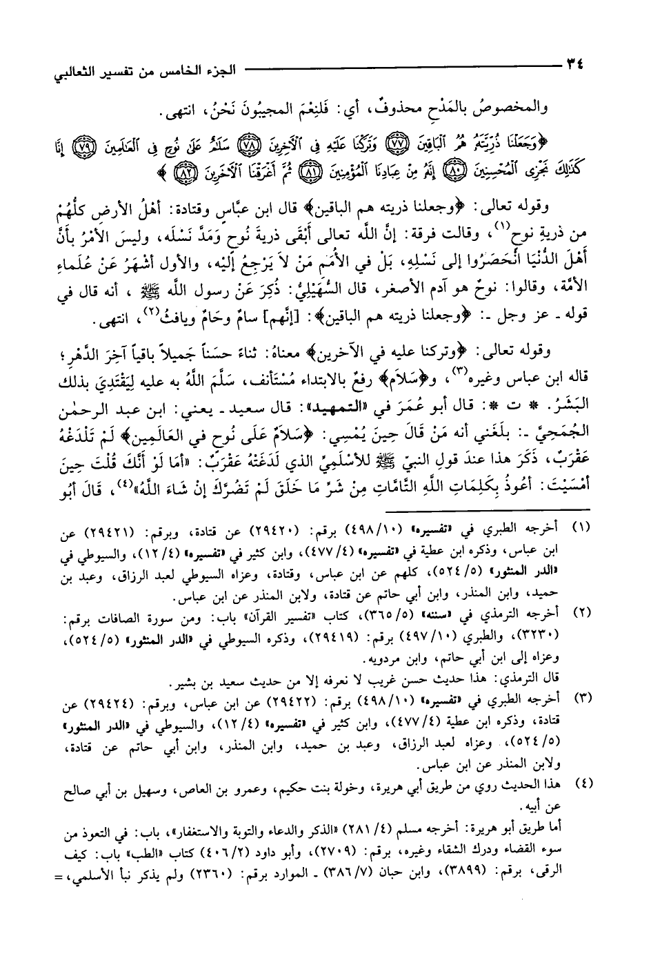 وقوله تعالى: وَجَعَلْنا ذُرِّيَّتَهُ هُمُ الْباقِينَ قال ابن عبَّاسٍ وقتادة: أهْلُ الأرضِ كلُّهُمْ من ذريةِ نوحٍ «1» ، وقالت فرقة: إنَّ اللَّه تعالى أَبْقَى ذريةَ نُوحٍ وَمَدَّ نَسْلَه، وليسَ الأمْرُ بأَنَّ أَهْلَ الدُّنْيَا انْحَصَرُوا إلى نَسْلِهِ، بَلْ في الأُمَمِ مَنْ لاَ يَرْجِعُ إليْه، والأول أشْهَرُ عَنْ عُلَماءِ الأمَّة، وقالوا: نوحٌ هو آدم الأصغر، قال السُّهَيْلِيُّ: ذُكِرَ عَنْ رسول الله صلّى الله عليه وسلّم، أنه قال في قوله- عز وجل-: وَجَعَلْنا ذُرِّيَّتَهُ هُمُ الْباقِينَ: [إنَّهم] سامٌ وحَامٌ ويافثُ «2» ، انتهى.