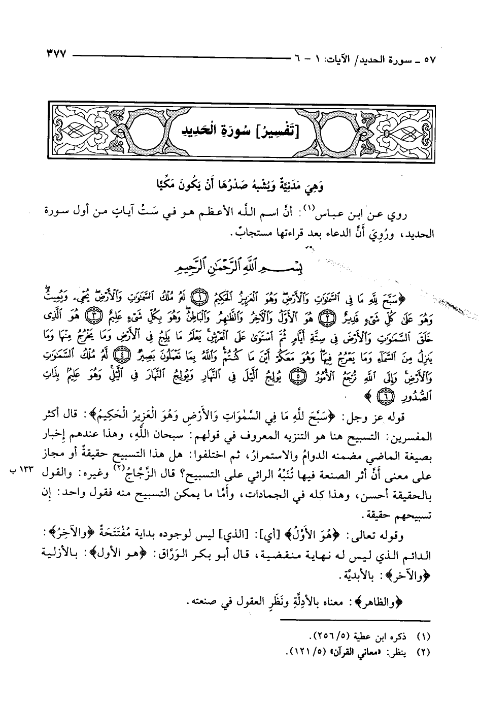 سَبَّحَ لِلَّهِ ما فِي السَّماواتِ وَالْأَرْضِ وَهُوَ الْعَزِيزُ الْحَكِيمُ (1) لَهُ مُلْكُ السَّماواتِ وَالْأَرْضِ يُحْيِي وَيُمِيتُ وَهُوَ عَلى كُلِّ شَيْءٍ قَدِيرٌ (2) هُوَ الْأَوَّلُ وَالْآخِرُ وَالظَّاهِرُ وَالْباطِنُ وَهُوَ بِكُلِّ شَيْءٍ عَلِيمٌ (3) هُوَ الَّذِي خَلَقَ السَّماواتِ وَالْأَرْضَ فِي سِتَّةِ أَيَّامٍ ثُمَّ اسْتَوى عَلَى الْعَرْشِ يَعْلَمُ ما يَلِجُ فِي الْأَرْضِ وَما يَخْرُجُ مِنْها وَما يَنْزِلُ مِنَ السَّماءِ وَما يَعْرُجُ فِيها وَهُوَ مَعَكُمْ أَيْنَ ما كُنْتُمْ وَاللَّهُ بِما تَعْمَلُونَ بَصِيرٌ (4)