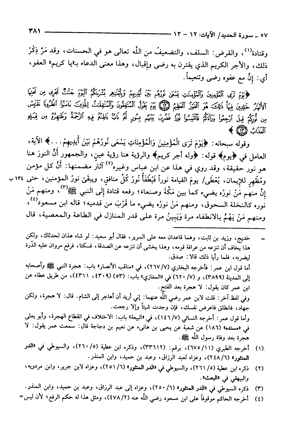 وقوله سبحانه: يَوْمَ تَرَى الْمُؤْمِنِينَ وَالْمُؤْمِناتِ يَسْعى نُورُهُمْ بَيْنَ أَيْدِيهِمْ ... الآية، العامل في يَوْمَ قوله: وَلَهُ أَجْرٌ كَرِيمٌ والرؤية هنا رؤية عينٍ، والجمهور أَنَّ النورَ هنا هو نور حقيقة، وقد روي في هذا عن ابن عباس وغيره «2» آثار مضمنها: أَنَّ كل مؤمن ومُظْهِرٍ للإيمان، يُعْطَى/ يومَ القيامة نوراً فَيُطْفَأُ نُورُ كُلِّ منافقٍ، ويبقى نورُ المؤمنين، حتى إِنَّ منهم مَنْ نورُه يضيء كما بين مكّة وصنعاء رفعه قتادة إلى النبي صلّى الله عليه وسلّم «3» ، ومنهم مَنْ نوره كالنخلة السحوق، ومنهم مَنْ نورُه يضيء ما قَرُبَ من قدميه قاله ابن مسعود «4» ، ومنهم مَنْ يَهُمُّ بالانطفاء مرة وَيَبِينُ مرة على قدر المنازل في الطاعة والمعصية، قال