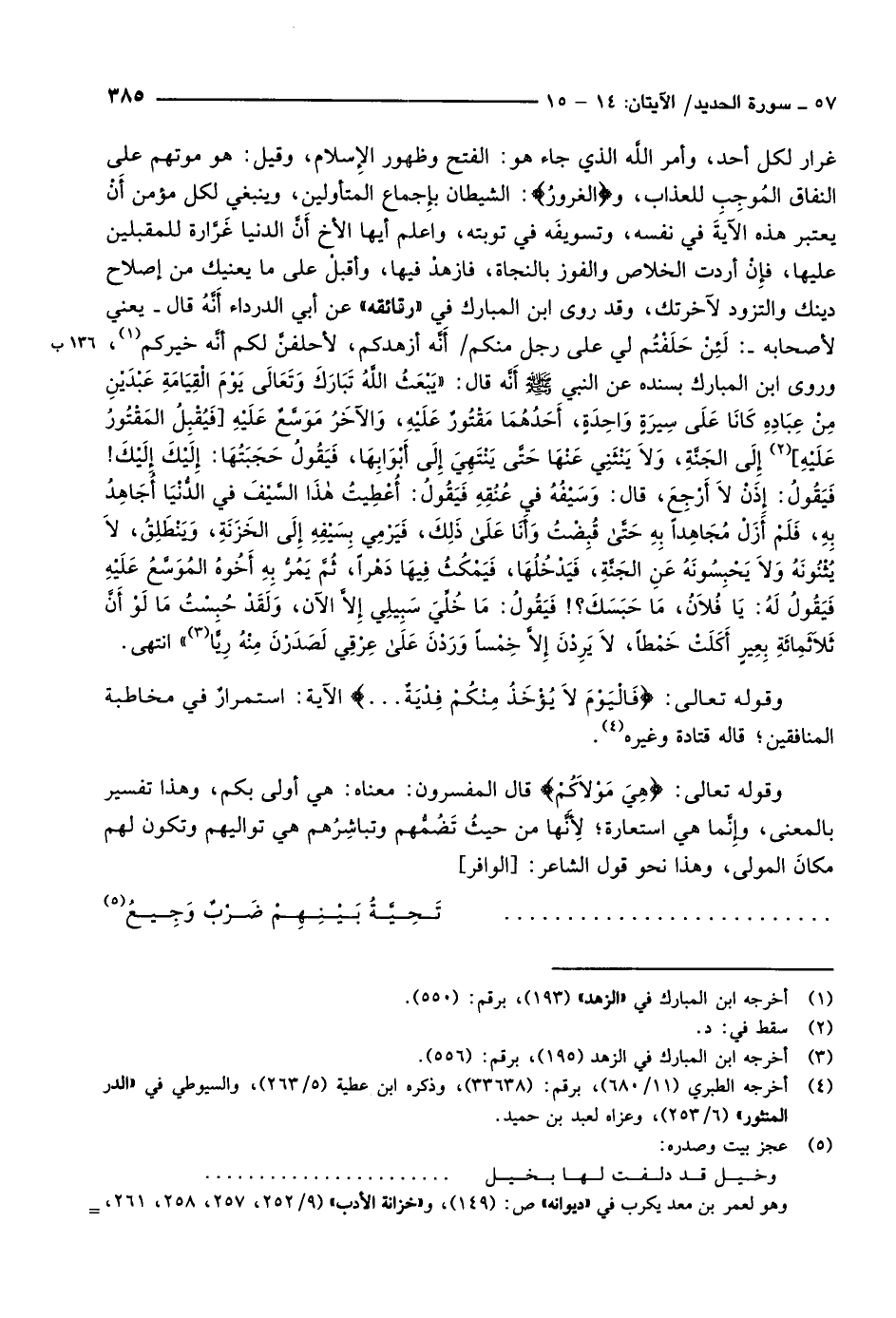 غرار لكل أحد، وأمر اللَّه الذي جاء هو: الفتح وظهور الإسلام، وقيل: هو موتهم على النفاق الموجب للعذاب، والْغَرُورُ: الشيطان بإجماع المتأولين، وينبغي لكل مؤمن أَنْ يعتبر هذه الآيةَ في نفسه، وتسويفَه في توبته، واعلم أيها الأخ أَنَّ الدنيا غَرَّارة للمقبلين عليها، فإنْ أردت الخلاص والفوز بالنجاة، فازهدْ فيها، وأقبلْ على ما يعنيك من إصلاح دينك والتزود لآخرتك، وقد روى ابن المبارك في «رقائقه» عن أبي الدرداء أَنَّهُ قال- يعني لأصحابه-: لَئِنْ حَلَفْتُم لي على رجل منكم/ أَنَّه أزهدكم، لأحلفنَّ لكم أنَّه خيركم «1» ، وروى ابن المبارك بسنده عن النبي صلّى الله عليه وسلّم أَنَّه قال: «يَبْعَثُ اللَّهُ تَبَارَكَ وَتَعَالَى يَوْمَ الْقِيَامَةِ عَبْدَيْنِ مِنْ عِبَادِهِ كَانَا عَلَى سِيرَةٍ وَاحِدَةٍ، أَحَدُهُمَا مَقْتُورٌ عَلَيْهِ، وَالآخَرُ مَوَسَّعٌ عَلَيْهِ [فَيُقْبِلُ المَقْتُورُ عَلَيْهِ] «2» إلَى الجَنَّةِ، وَلاَ يَنْثَنِي عَنْهَا حَتَّى يَنْتَهِيَ إلَى أَبْوَابِهَا، فَيَقُولُ حَجَبَتُهَا: إلَيْكَ إلَيْكَ! فَيَقُولُ: إذَنْ لاَ أَرْجِعَ، قال: وَسَيْفُهُ في عُنُقِهِ فَيَقُولُ: أُعْطِيتُ هذا السَّيْفَ في الدُّنْيَا أُجَاهِدُ بِهِ، فَلَمْ أَزَلْ مُجَاهِداً بِهِ حتى قُبِضْتُ وَأَنَا على ذَلِكَ، فَيَرْمِي بِسَيْفِهِ إلَى الخَزَنَةِ، وَيَنْطَلِقُ، لاَ يُثْنُونَهُ وَلاَ يَحْبِسُونَهُ عَنِ الجَنَّةِ، فَيَدْخُلُهَا، فَيَمْكُثُ فِيهَا دَهْراً، ثُمَّ يَمُرُّ بِهِ أَخُوهُ المُوَسَّعُ عَلَيْهِ فَيَقُولُ لَهُ: يَا فُلاَنُ، مَا حَبَسَكَ؟! فَيَقُولُ: مَا خُلِّيَ سَبِيلِي إلاَّ الآن، وَلَقَدْ حُبِسْتُ مَا لَوْ أَنَّ ثَلاَثَمِائَةِ بِعِيرٍ أَكَلَتْ خَمْطاً، لاَ يَرِدْنَ إلاَّ خِمْساً وَرَدْنَ على عِرْقِي لَصَدَرْنَ مِنْهُ رِيًّا «3» » انتهى.