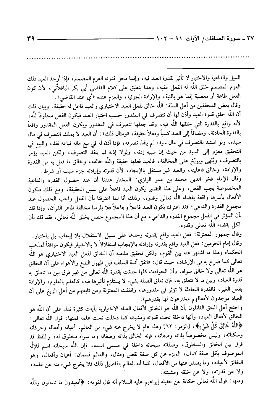 وقال الإمام فخر الدين محمّد بن عمر الرازي: المختار عندنا أن عند حصول القدرة والداعية المخصوصة يجب الفعل، وعلى هذا التقدير يكون العبد فاعلا على سبيل الحقيقة، ومع ذلك فتكون الأفعال بأسرها واقعة بقضاء الله تعالى وقدره، وذلك أنا لما اعترفنا بأن الفعل واجب الحصول عند مجموع القدرة والداعي فقد اعترفنا بكون العبد فاعلا وجاعلا فلا يلزمنا مخالفة ظاهر القرآن، وإذا قلنا بأن المؤثر في الفعل مجموع القدرة والداعي، مع أن هذا المجموع حصل بخلق الله تعالى، فقد قلنا بأن الكل بقضاء الله تعالى وقدره.
