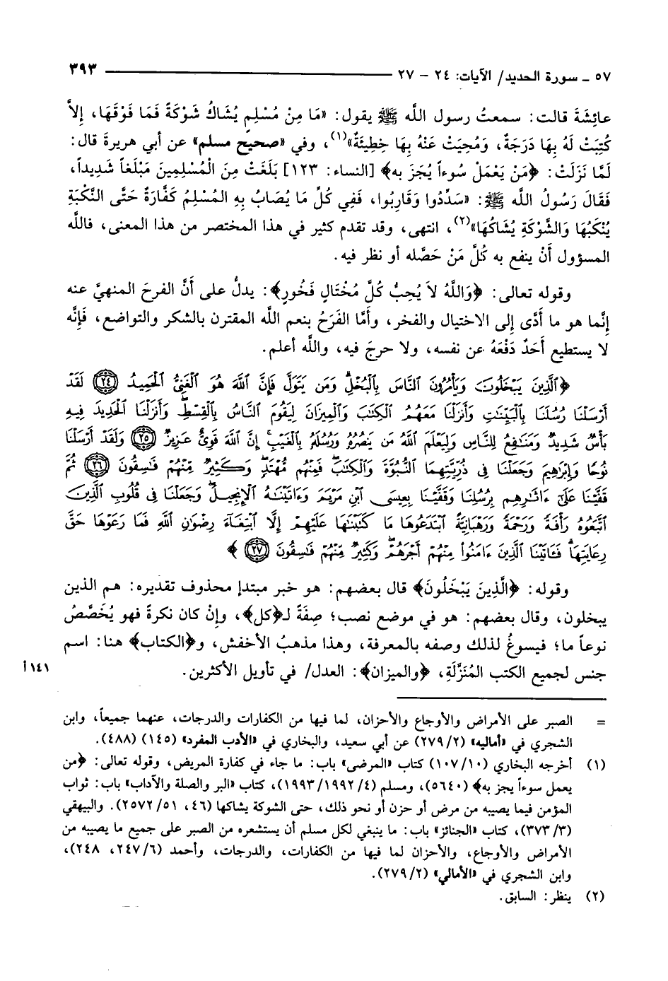 الَّذِينَ يَبْخَلُونَ وَيَأْمُرُونَ النَّاسَ بِالْبُخْلِ وَمَنْ يَتَوَلَّ فَإِنَّ اللَّهَ هُوَ الْغَنِيُّ الْحَمِيدُ (24) لَقَدْ أَرْسَلْنا رُسُلَنا بِالْبَيِّناتِ وَأَنْزَلْنا مَعَهُمُ الْكِتابَ وَالْمِيزانَ لِيَقُومَ النَّاسُ بِالْقِسْطِ وَأَنْزَلْنَا الْحَدِيدَ فِيهِ بَأْسٌ شَدِيدٌ وَمَنافِعُ لِلنَّاسِ وَلِيَعْلَمَ اللَّهُ مَنْ يَنْصُرُهُ وَرُسُلَهُ بِالْغَيْبِ إِنَّ اللَّهَ قَوِيٌّ عَزِيزٌ (25) وَلَقَدْ أَرْسَلْنا نُوحاً وَإِبْراهِيمَ وَجَعَلْنا فِي ذُرِّيَّتِهِمَا النُّبُوَّةَ وَالْكِتابَ فَمِنْهُمْ مُهْتَدٍ وَكَثِيرٌ مِنْهُمْ فاسِقُونَ (26) ثُمَّ قَفَّيْنا عَلى آثارِهِمْ بِرُسُلِنا وَقَفَّيْنا بِعِيسَى ابْنِ مَرْيَمَ وَآتَيْناهُ الْإِنْجِيلَ وَجَعَلْنا فِي قُلُوبِ الَّذِينَ اتَّبَعُوهُ رَأْفَةً وَرَحْمَةً وَرَهْبانِيَّةً ابْتَدَعُوها ما كَتَبْناها عَلَيْهِمْ إِلاَّ ابْتِغاءَ رِضْوانِ اللَّهِ فَما رَعَوْها حَقَّ رِعايَتِها فَآتَيْنَا الَّذِينَ آمَنُوا مِنْهُمْ أَجْرَهُمْ وَكَثِيرٌ مِنْهُمْ فاسِقُونَ (27)