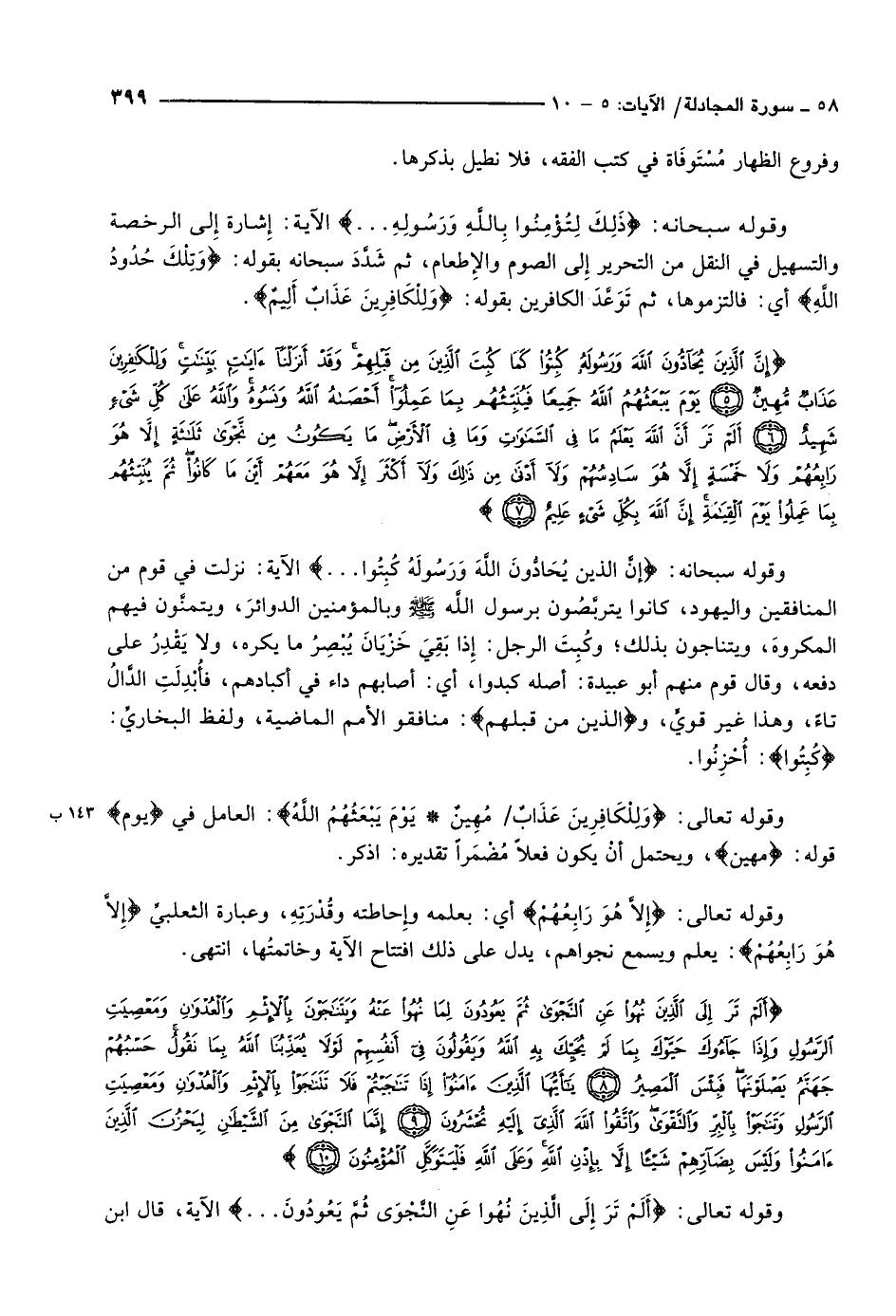 إِنَّ الَّذِينَ يُحَادُّونَ اللَّهَ وَرَسُولَهُ كُبِتُوا كَما كُبِتَ الَّذِينَ مِنْ قَبْلِهِمْ وَقَدْ أَنْزَلْنا آياتٍ بَيِّناتٍ وَلِلْكافِرِينَ عَذابٌ مُهِينٌ (5) يَوْمَ يَبْعَثُهُمُ اللَّهُ جَمِيعاً فَيُنَبِّئُهُمْ بِما عَمِلُوا أَحْصاهُ اللَّهُ وَنَسُوهُ وَاللَّهُ عَلى كُلِّ شَيْءٍ شَهِيدٌ (6) أَلَمْ تَرَ أَنَّ اللَّهَ يَعْلَمُ ما فِي السَّماواتِ وَما فِي الْأَرْضِ ما يَكُونُ مِنْ نَجْوى ثَلاثَةٍ إِلاَّ هُوَ رابِعُهُمْ وَلا خَمْسَةٍ إِلاَّ هُوَ سادِسُهُمْ وَلا أَدْنى مِنْ ذلِكَ وَلا أَكْثَرَ إِلاَّ هُوَ مَعَهُمْ أَيْنَ ما كانُوا ثُمَّ يُنَبِّئُهُمْ بِما عَمِلُوا يَوْمَ الْقِيامَةِ إِنَّ اللَّهَ بِكُلِّ شَيْءٍ عَلِيمٌ (7)