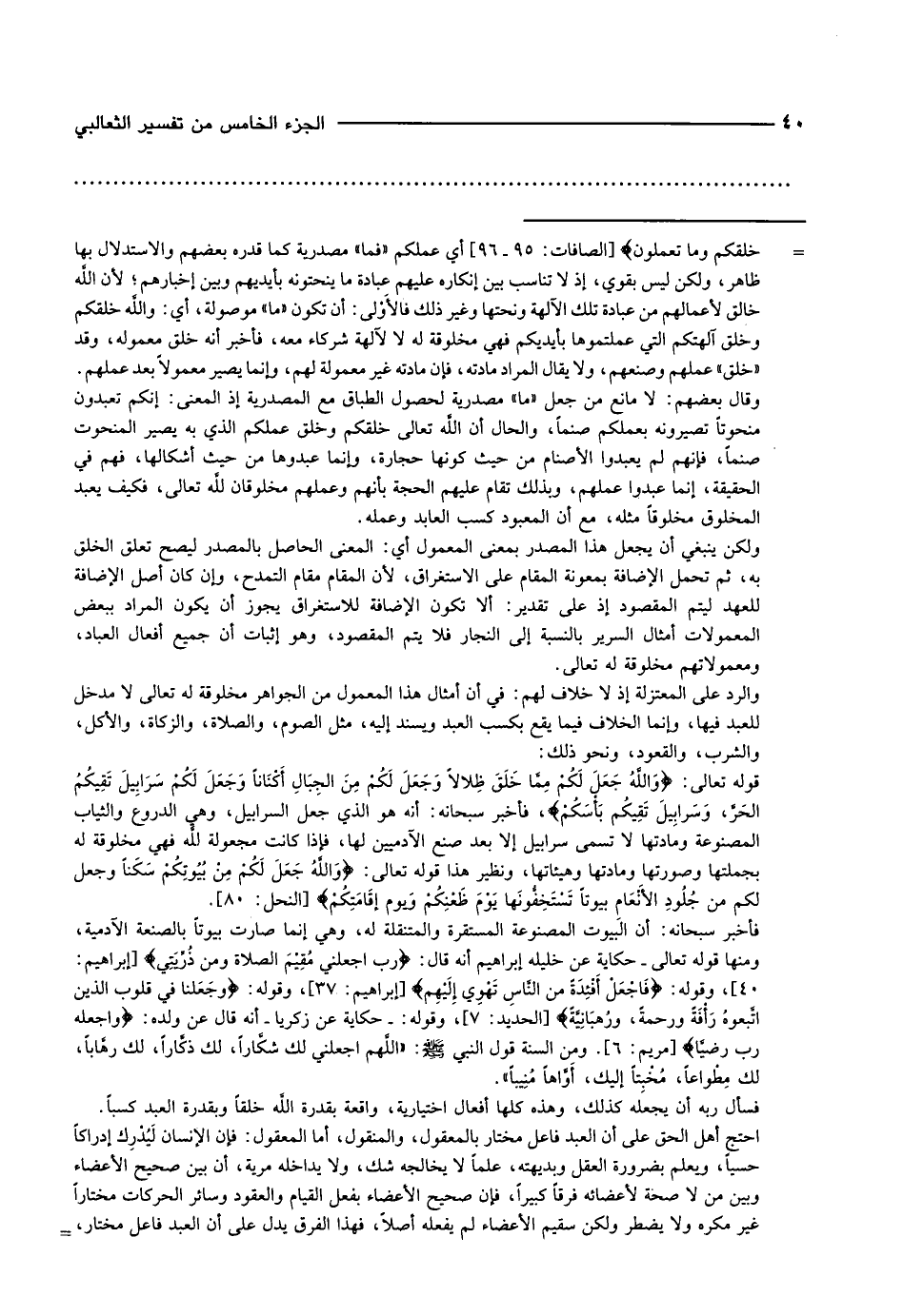 - خَلَقَكُمْ وَما تَعْمَلُونَ [الصافات: 95- 96] أي عملكم «فما» مصدرية كما قدره بعضهم والاستدلال بها ظاهر، ولكن ليس بقوي، إذ لا تناسب بين إنكاره عليهم عبادة ما ينحتونه بأيديهم وبين إخبارهم لأن الله خالق لأعمالكم من عبادة تلك الآلهة ونحتها وغير ذلك فالأولى: أن تكون «ما» موصولة، أي: والله خلقكم وخلق آلهتكم التي عملتموها بأيديكم فهي مخلوقة له لا لآلهة شركاء معه، فأخبر أنه خلق معموله، وقد «خلق» عملهم وصنعهم، ولا يقال المراد مادته، فإن مادته غير معمولة لهم، وإنما يصير معمولا بعد عملهم.