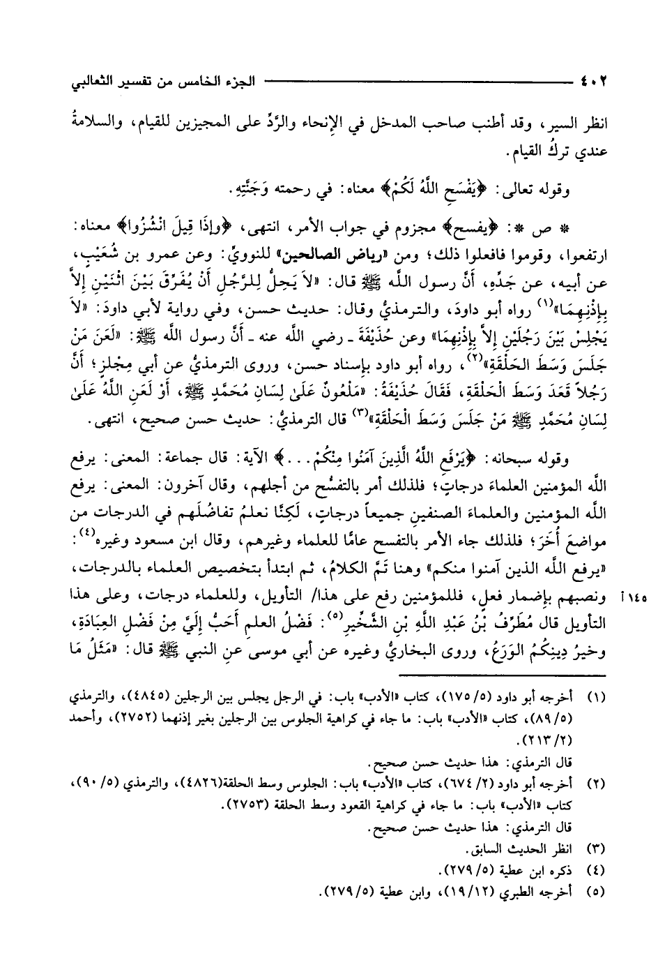 ارتفعوا، وقوموا فافعلوا ذلك ومن «رياض الصالحين» للنوويِّ: وعن عمرو بن شُعَيْب، عن أبيه، عن جَدِّه، أنّ رسول الله صلّى الله عليه وسلّم قال: «لاَ يَحِلُّ لِلرَّجُلِ أَنْ يُفَرِّقَ بَيْنَ اثْنَيْنِ إلاَّ بِإذْنِهِمَا» «1» رواه أبو داودَ، والترمذيُّ وقال: حديث حسن، وفي رواية لأبي داودَ: «لاَ يَجْلِسْ بَيْنَ رَجُلَيْنِ إلاَّ بِإذْنِهِمَا» وعن حُذَيْفَةَ- رضي اللَّه عنه- أَنَّ رسول اللَّه صلّى الله عليه وسلّم: «لَعَنَ مَنْ جَلَسَ وَسَطَ الحَلْقَةِ» «2» ، رواه أبو داود بإسناد حسن، وروى الترمذيُّ عن أبي مِجْلِزٍ أَنَّ رَجُلاً قَعَدَ وَسَطَ الْحَلْقَةِ، فَقَالَ حذيفة: «ملعون على لسان محمّد صلّى الله عليه وسلّم، أو لعن الله على لسان محمّد صلّى الله عليه وسلّم مَنْ جَلَسَ وَسَطَ الْحَلْقَةِ» «3» قال الترمذيُّ: حديث حسن صحيح، انتهى.