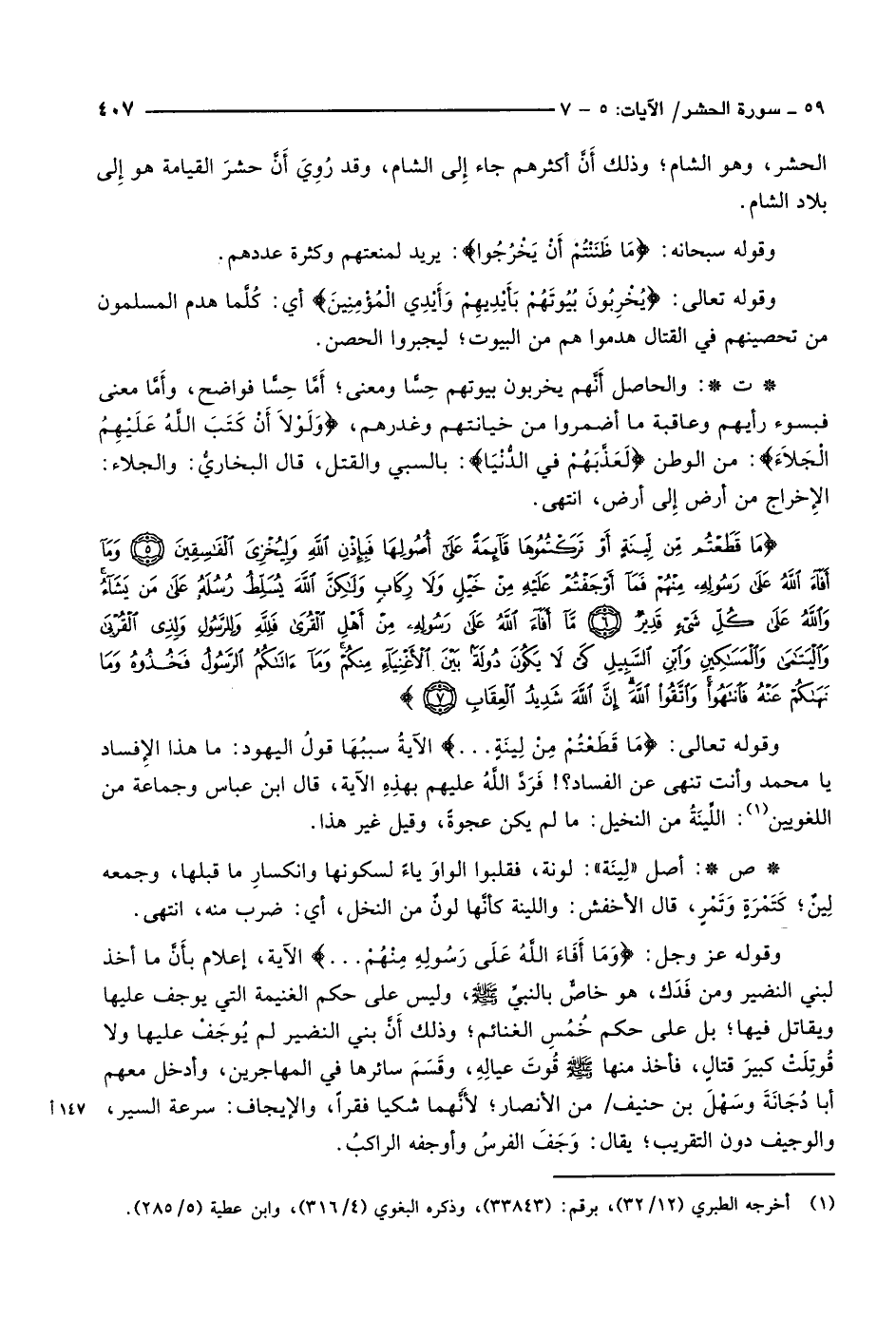 ما قَطَعْتُمْ مِنْ لِينَةٍ أَوْ تَرَكْتُمُوها قائِمَةً عَلى أُصُولِها فَبِإِذْنِ اللَّهِ وَلِيُخْزِيَ الْفاسِقِينَ (5) وَما أَفاءَ اللَّهُ عَلى رَسُولِهِ مِنْهُمْ فَما أَوْجَفْتُمْ عَلَيْهِ مِنْ خَيْلٍ وَلا رِكابٍ وَلكِنَّ اللَّهَ يُسَلِّطُ رُسُلَهُ عَلى مَنْ يَشاءُ وَاللَّهُ عَلى كُلِّ شَيْءٍ قَدِيرٌ (6) مَّا أَفاءَ اللَّهُ عَلى رَسُولِهِ مِنْ أَهْلِ الْقُرى فَلِلَّهِ وَلِلرَّسُولِ وَلِذِي الْقُرْبى وَالْيَتامى وَالْمَساكِينِ وَابْنِ السَّبِيلِ كَيْ لاَ يَكُونَ دُولَةً بَيْنَ الْأَغْنِياءِ مِنْكُمْ وَما آتاكُمُ الرَّسُولُ فَخُذُوهُ وَما نَهاكُمْ عَنْهُ فَانْتَهُوا وَاتَّقُوا اللَّهَ إِنَّ اللَّهَ شَدِيدُ الْعِقابِ (7)