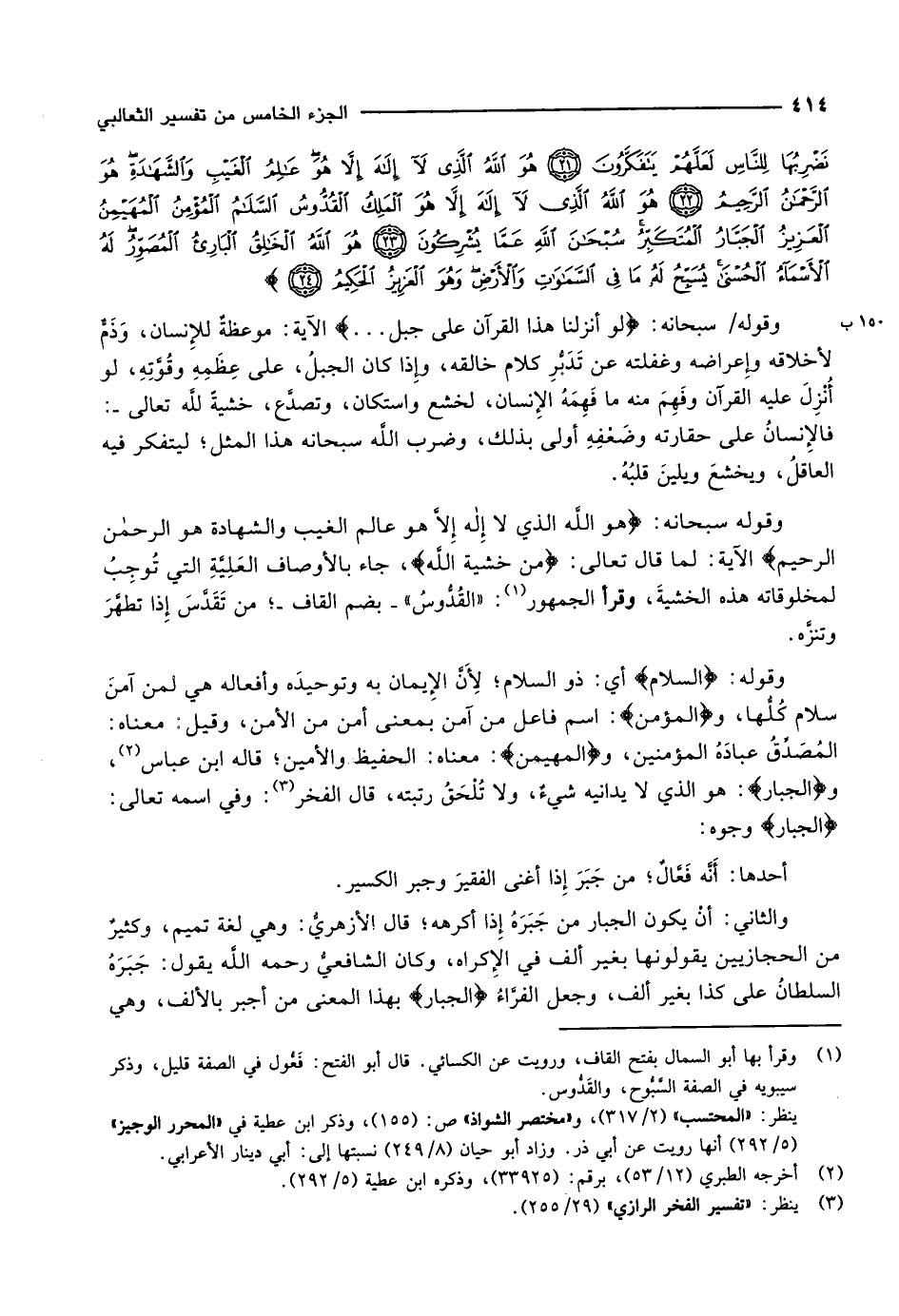 وقوله سبحانه: هُوَ اللَّهُ الَّذِي لاَ إِلهَ إِلَّا هُوَ عالِمُ الْغَيْبِ وَالشَّهادَةِ هُوَ الرَّحْمنُ الرَّحِيمُ الآية: لما قال تعالى: مِنْ خَشْيَةِ اللَّهِ، جاء بالأوصاف العَلِيَّةِ التي تُوجِبُ لمخلوقاته هذه الخشيةَ، وقرأ الجمهور «1» : «القُدُّوسُ» - بضم القاف- من تَقَدَّسَ إذا تطهَّرَ وتنزَّه.