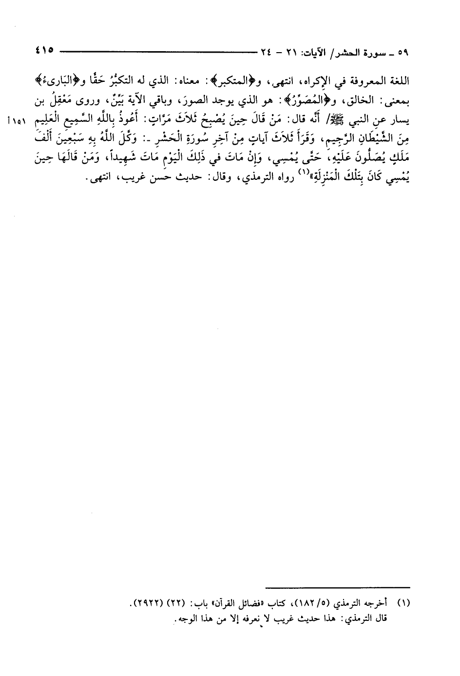 اللغة المعروفة في الإكراه، انتهى، والْمُتَكَبِّرُ: معناه: الذي له التكبّر حقّا والْبارِئُ بمعنى: الخالق، والْمُصَوِّرُ: هو الذي يوجد الصورَ، وباقي الآية بَيِّنٌ، وروى معقل بن يسار عن النبي صلّى الله عليه وسلّم/ أَنَّه قال: مَنْ قَالَ حِينَ يُصْبِحُ ثَلاَثَ مَرَّاتٍ: أَعُوذُ بِاللَّهِ السَّمِيعِ الْعَلِيمِ مِنَ الشَّيْطَانِ الرَّجِيمِ، وَقَرَأَ ثَلاَثَ آياتٍ مِنْ آخِرِ سُورَةِ الْحَشْرِ-: وَكَّلَ اللَّهُ بِهِ سَبْعِينَ أَلْفَ مَلَكٍ يُصَلُّونَ عَلَيْهِ، حَتَّى يُمْسِي، وَإنْ مَاتَ في ذَلِكَ الْيَوْمِ مَاتَ شَهِيداً، وَمَنْ قَالَهَا حِينَ يُمْسِي كَانَ بِتَلْكَ الْمَنْزِلَةِ» «1» رواه الترمذي، وقال: حديث حسن غريب، انتهى.