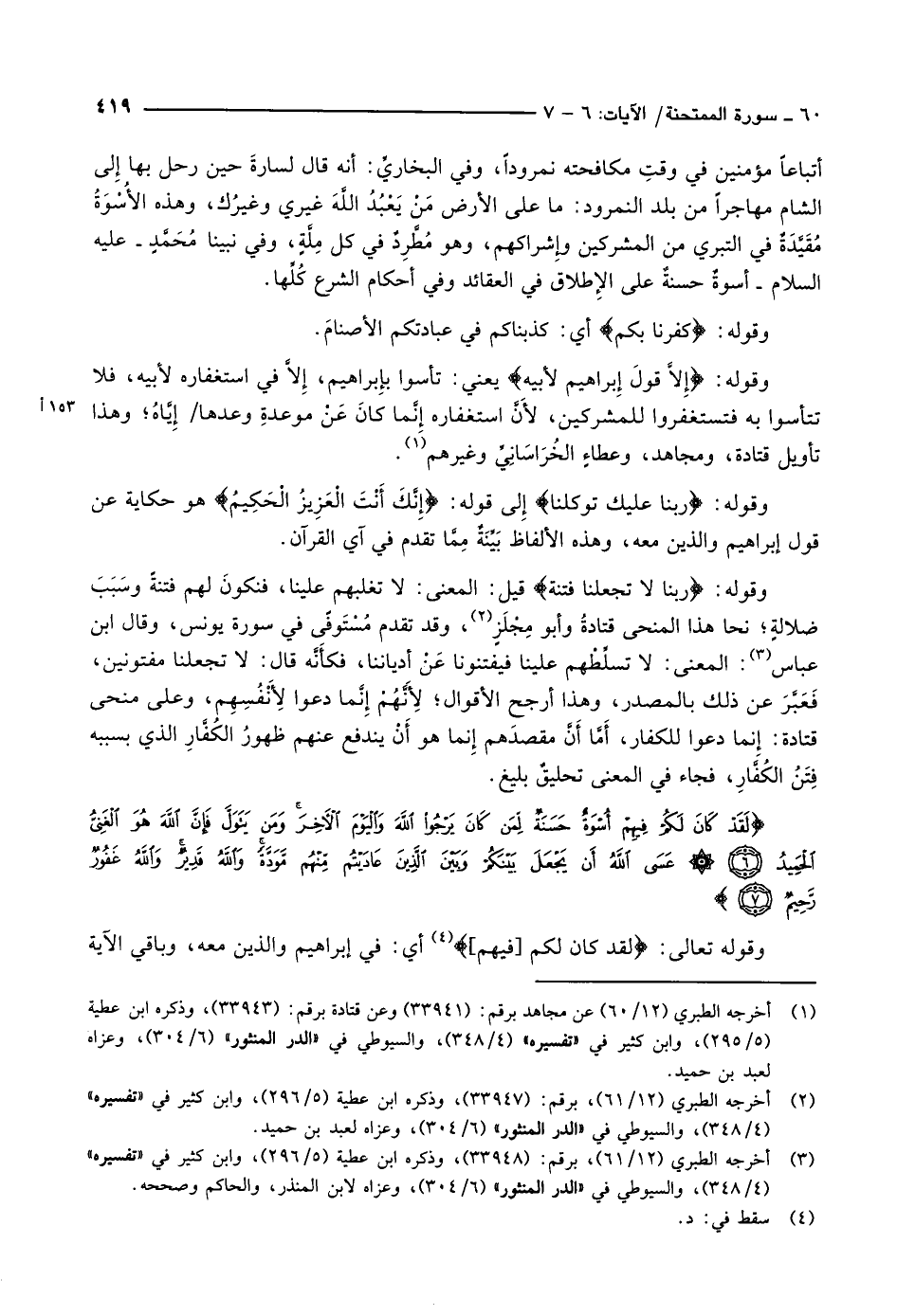 أتباعاً مؤمنين في وقتِ مكافحته نمروداً، وفي البخاريِّ: أنه قال لسارةَ حين رحل بها إلى الشام مهاجراً من بلد النمرود: ما على الأرض مَنْ يَعْبُدُ اللَّهَ غيري وغيرُك، وهذه الأُسْوَةُ مُقَيَّدَةٌ في التبري من المشركين وإشراكهم، وهو مُطَّرِدٌ في كل مِلَّةٍ، وفي نبينا مُحَمَّدٍ- عليه السلام- أسوةٌ حسنةٌ على الإطلاق في العقائد وفي أحكام الشرع كُلِّها.