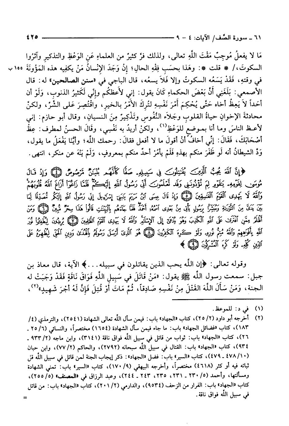 وقوله تعالى: إِنَّ اللَّهَ يُحِبُّ الَّذِينَ يُقاتِلُونَ فِي سَبِيلِهِ ... الآية، قال معاذ بن جبل: سمعت رسول الله صلّى الله عليه وسلّم يقول: «مَنْ قَاتَلَ في سَبِيلِ اللَّهِ فَوَاقَ نَاقَةٍ فَقَدْ وَجَبَتْ له الجنة، وَمَنْ سَأَلَ اللَّهَ القَتْلَ مِنْ نَفْسِهِ صَادِقاً، ثُمَّ مَاتَ أو قتل فإنّ له أجر شهيد» «2» ،