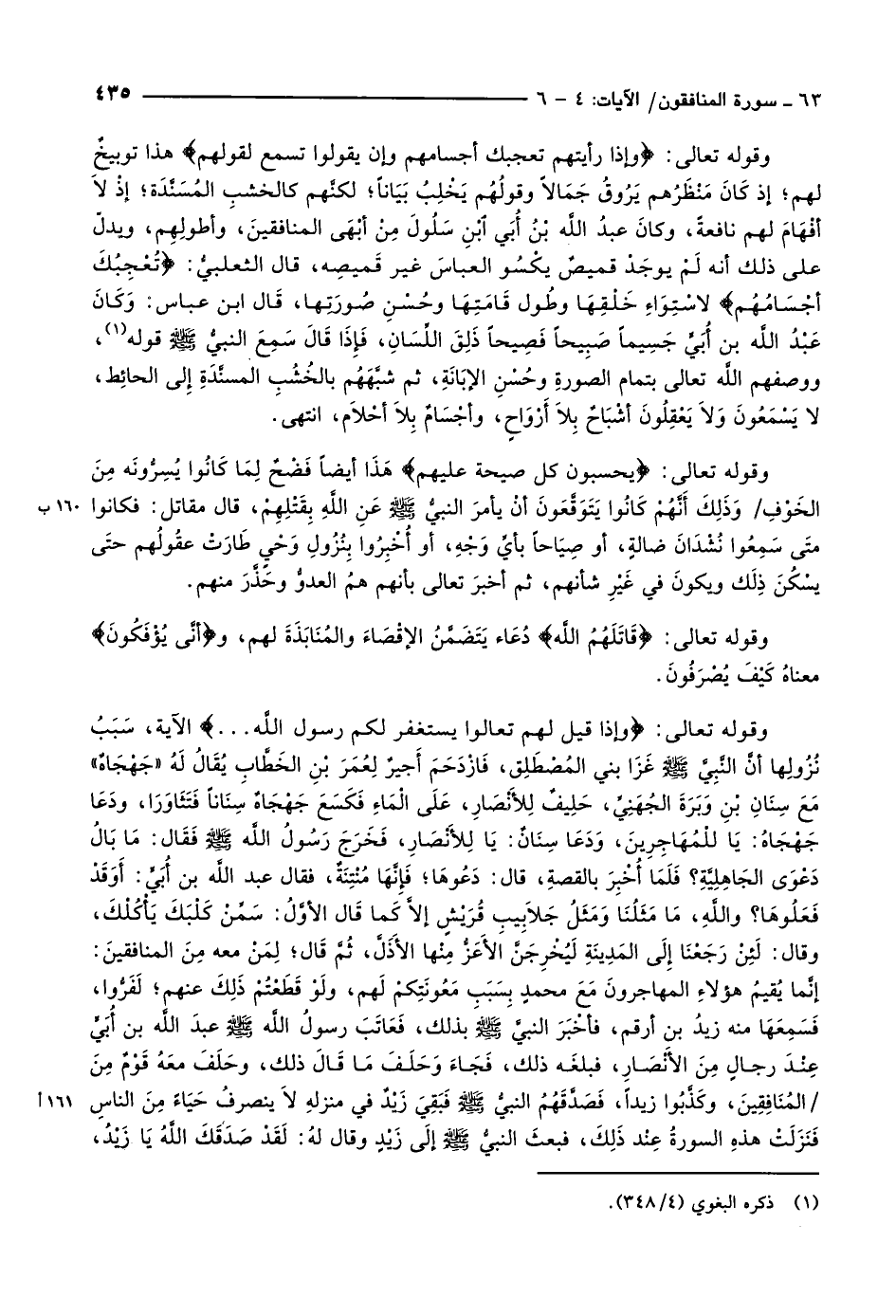 وقوله تعالى: وَإِذا رَأَيْتَهُمْ تُعْجِبُكَ أَجْسامُهُمْ وَإِنْ يَقُولُوا تَسْمَعْ لِقَوْلِهِمْ هذا توبيخٌ لهم إذ كَانَ مَنْظَرُهم يَرُوقُ جَمَالاً وقولُهُم يَخْلِبُ بَيَاناً لكنَّهم كالخشبِ المُسَنَّدَة إذْ لاَ أفْهَامَ لهم نافعةً، وكانَ عبدُ اللَّه بْنُ أُبَي ابن سَلُولَ مِنْ أبْهَى المنافقينَ، وأطولِهِم، ويدلّ على ذلك أنه لَمْ يوجَدْ قميصٌ يكْسُو العباسَ غيرُ قَميصِه، قال الثعلبيُّ: تُعْجِبُكَ أَجْسامُهُمْ لاسْتِوَاءِ خَلْقِهَا وطُول قَامَتِهَا وحُسْنِ صُورَتِها، قَال ابن عباس: وَكَانَ عَبْدُ اللَّه بن أُبَيٍّ جَسِيماً صَبِيحاً فَصِيحاً ذَلِقَ اللِّسَانِ، فَإذَا قَالَ سَمِعَ النبيّ صلّى الله عليه وسلّم قوله «1» ، ووصفهم اللَّه تعالى بتمام الصورةِ وحُسْنِ الإبَانَةِ، ثم شبَّهَهُم بالخُشُبِ المسنَّدَةِ إلى الحائِط، لا يَسْمَعُونَ وَلاَ يَعْقِلُونَ أشْبَاحٌ بِلاَ أَرْوَاحٍ، وأجْسَامٌ بِلاَ أحْلاَم، انتهى.