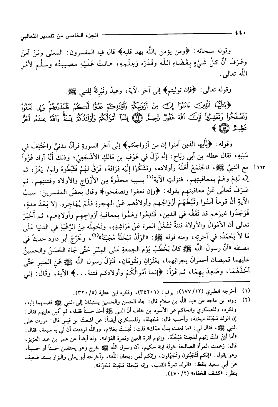يا أَيُّهَا الَّذِينَ آمَنُوا إِنَّ مِنْ أَزْواجِكُمْ وَأَوْلادِكُمْ عَدُوًّا لَكُمْ فَاحْذَرُوهُمْ وَإِنْ تَعْفُوا وَتَصْفَحُوا وَتَغْفِرُوا فَإِنَّ اللَّهَ غَفُورٌ رَحِيمٌ (14) إِنَّما أَمْوالُكُمْ وَأَوْلادُكُمْ فِتْنَةٌ وَاللَّهُ عِنْدَهُ أَجْرٌ عَظِيمٌ (15)