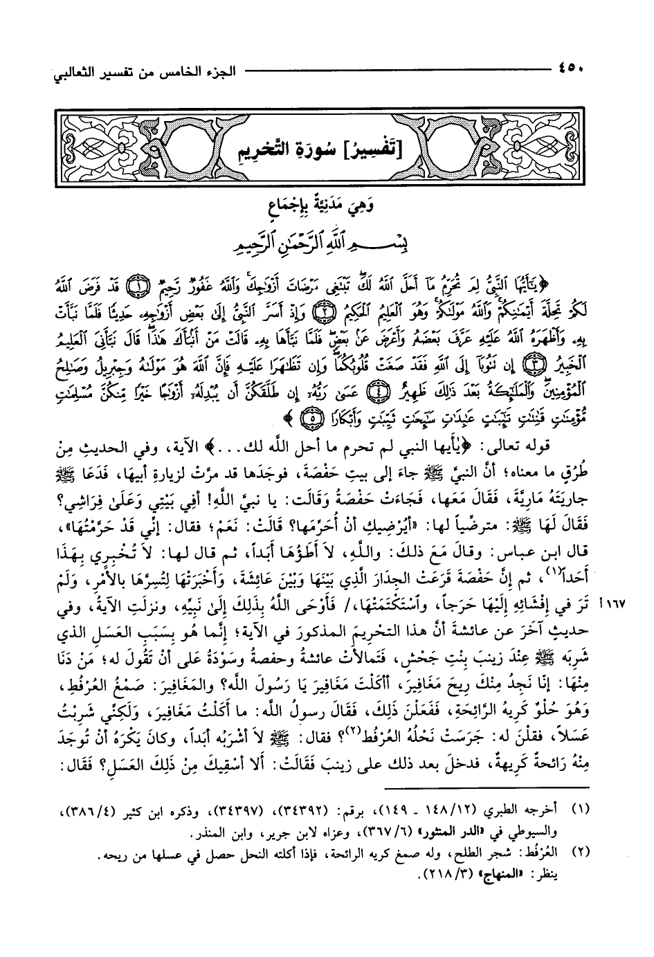 يا أَيُّهَا النَّبِيُّ لِمَ تُحَرِّمُ مَا أَحَلَّ اللَّهُ لَكَ تَبْتَغِي مَرْضاتَ أَزْواجِكَ وَاللَّهُ غَفُورٌ رَحِيمٌ (1) قَدْ فَرَضَ اللَّهُ لَكُمْ تَحِلَّةَ أَيْمانِكُمْ وَاللَّهُ مَوْلاكُمْ وَهُوَ الْعَلِيمُ الْحَكِيمُ (2) وَإِذْ أَسَرَّ النَّبِيُّ إِلى بَعْضِ أَزْواجِهِ حَدِيثاً فَلَمَّا نَبَّأَتْ بِهِ وَأَظْهَرَهُ اللَّهُ عَلَيْهِ عَرَّفَ بَعْضَهُ وَأَعْرَضَ عَنْ بَعْضٍ فَلَمَّا نَبَّأَها بِهِ قالَتْ مَنْ أَنْبَأَكَ هذا قالَ نَبَّأَنِيَ الْعَلِيمُ الْخَبِيرُ (3) إِنْ تَتُوبا إِلَى اللَّهِ فَقَدْ صَغَتْ قُلُوبُكُما وَإِنْ تَظاهَرا عَلَيْهِ فَإِنَّ اللَّهَ هُوَ مَوْلاهُ وَجِبْرِيلُ وَصالِحُ الْمُؤْمِنِينَ وَالْمَلائِكَةُ بَعْدَ ذلِكَ ظَهِيرٌ (4)