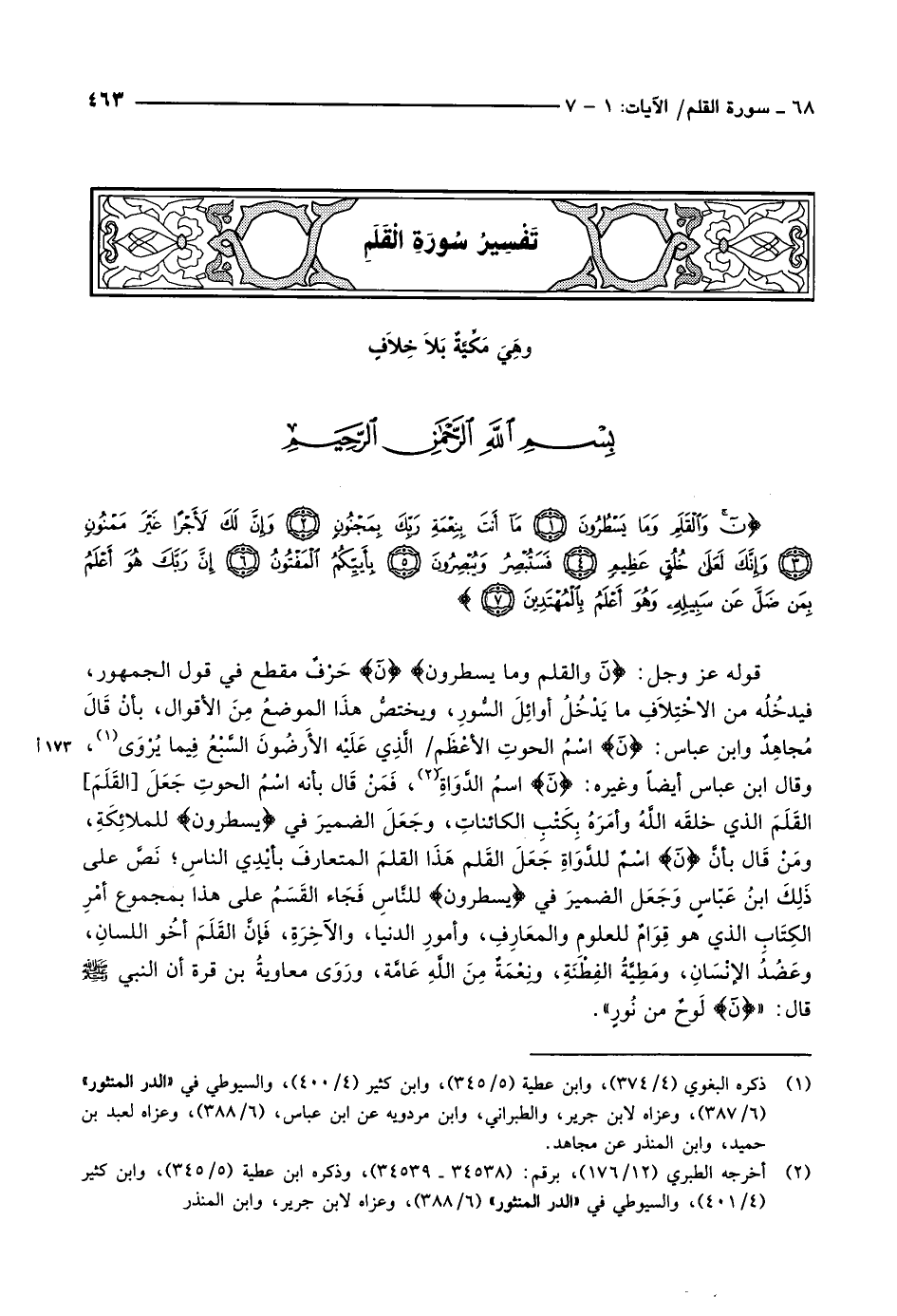 قوله عز وجل: ن وَالْقَلَمِ وَما يَسْطُرُونَ ن حَرْفٌ مقطع في قول الجمهور، فيدخُلُه من الاخْتِلاَفِ ما يَدْخُلُ أوائِلَ السُّورِ، ويختصُّ هذَا الموضعُ مِنَ الأقوال، بأنْ قَالَ مُجاهِدٌ وابن عباس: ن اسْمُ الحوتِ الأعْظَمِ/ الَّذِي عَلَيْه الأَرضُونَ السَّبْعُ فِيما يُرْوَى «1» ، وقال ابن عباس أيضاً وغيره: ن اسمُ الدَّوَاةِ «2» ، فَمَنْ قَال بأنه اسْمُ الحوتِ جَعَلَ [القَلَمَ] القَلَمَ الذي خلقَه اللَّهُ وأمَرَهُ بِكَتْبِ الكائناتِ، وجَعَلَ الضميرَ في يَسْطُرُونَ للملائِكَةِ، ومَنْ قَال بأنَّ ن اسْمٌ للدَّوَاةِ جَعَلَ القَلم هَذَا القلمَ المتعارفَ بأيْدِي الناسِ نَصَّ على ذَلِكَ ابنُ عَبّاسٍ وَجَعَل الضميرَ في يَسْطُرُونَ للنَّاسِ فَجَاء القَسَمُ على هذا بمجموع أمْرِ الكِتَابِ الذي هو قِوَامٌ للعلومِ والمعَارِفِ، وأمورِ الدنيا، والآخِرَةِ، فَإنَّ القَلَمَ أخُو اللسانِ، وعَضُدُ الإنْسَانِ، ومَطِيَّةُ الفِطْنَةِ، ونِعْمَةٌ مِنَ اللَّهِ عَامَّة، ورَوَى معاويةُ بن قرة أن النبي صلّى الله عليه وسلّم قال: «ن لوح من نور» .