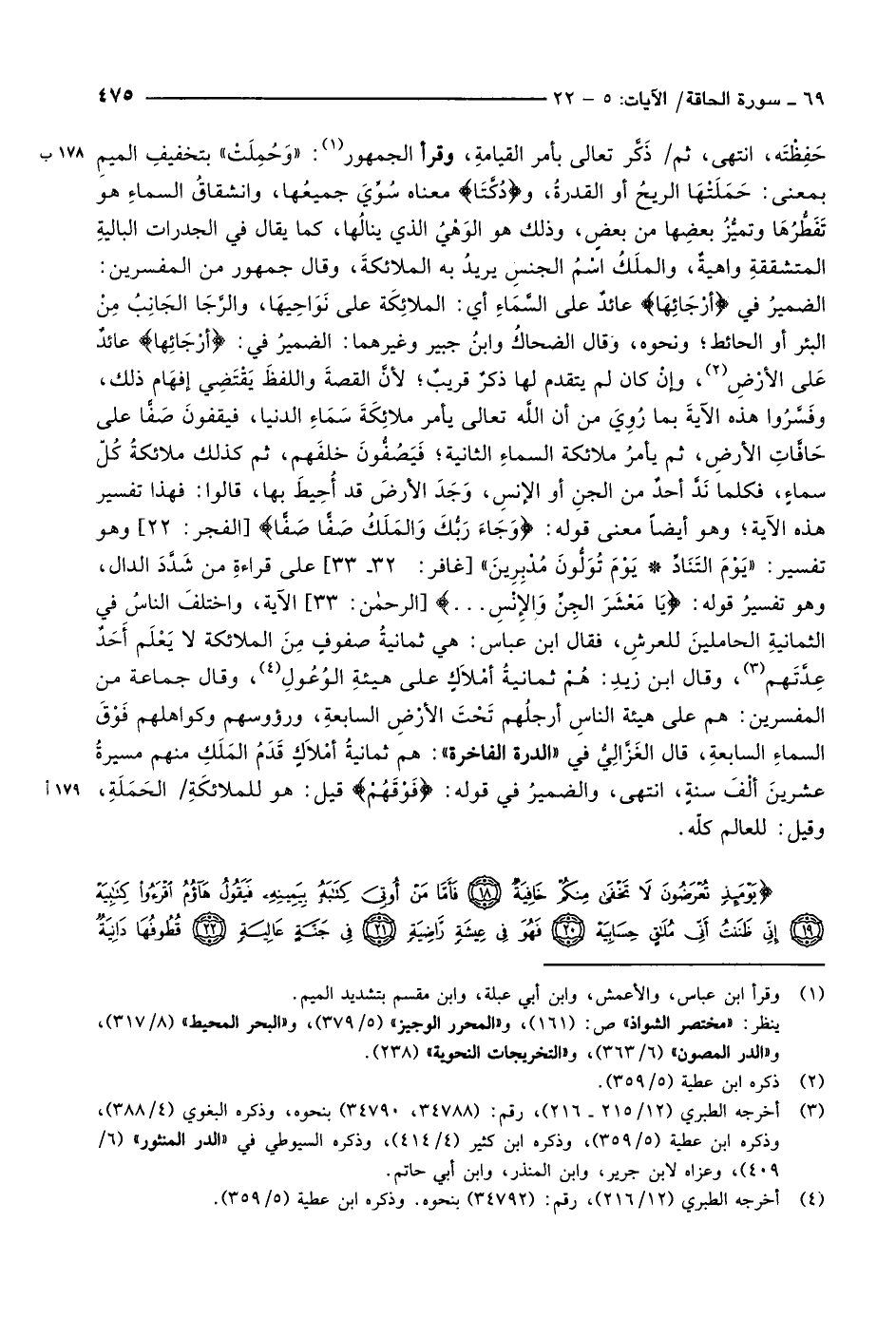 الضميرُ في أَرْجائِها عائدٌ على السَّمَاءِ أي: الملائِكَة على نواحيها، والرجاء الجَانِبُ مِنْ البئر أو الحائط ونحوه، وقال الضحاكُ وابنُ جبير وغيرهما: الضميرُ في: أَرْجائِها عائدٌ عَلى الأرْضِ «2» ، وإنْ كان لم يتقدم لها ذكرٌ قريبٌ لأنَّ القصةَ واللفظَ يَقْتَضِي إفهَام ذلك، وفَسَّرُوا هذه الآيةَ بما رُوِيَ من أن اللَّه تعالى يأمر ملائِكَةَ سَمَاءِ الدنيا، فيقفونَ صَفًّا على حَافَّاتِ الأرضِ، ثم يأمرُ ملائكة السماءِ الثانية فَيَصُفُّونَ خلفَهم، ثم كذلك ملائكةُ كُلّ سماءٍ، فكلما نَدَّ أحدٌ من الجنِ أو الإنسِ، وَجَدَ الأرضَ قد أُحِيطَ بها، قالوا: فهذا تفسير هذه الآية وهو أيضاً معنى قوله: وَجاءَ رَبُّكَ وَالْمَلَكُ صَفًّا صَفًّا [الفجر: 22] وهو تفسير: «يَوْمَ التناد يَوْمَ تُوَلُّونَ مُدْبِرِينَ» [غافر: 32- 33] على قراءةِ من شَدَّدَ الدال، وهو تفسيرُ قوله: يَا مَعْشَرَ الْجِنِّ وَالْإِنْسِ ... [الرحمن: 33] الآية، واختلفَ الناسُ في الثمانيةِ الحاملينَ للعرشِ، فقال ابن عباس: هي ثمانيةُ صفوفٍ مِنَ الملائكة لا يَعْلَم أَحَدٌ عِدَّتَهم «3» ، وقال ابن زيدِ: هُمْ ثمانيةُ أمْلاَكٍ على هيئةِ الوُعُولِ «4» ، وقال جماعة من المفسرين: هم على هيئة الناسِ أرجلُهم تَحْتَ الأرْضِ السابعةِ، ورؤوسهم وكواهلهم فَوْقَ السماءِ السابعةِ، قال الغَزَّالِيُّ في «الدرة الفاخرة» : هم ثمانيةُ أمْلاَكٍ قَدَمُ المَلَكِ منهم مسيرةُ عشرينَ ألْفَ سنةٍ، انتهى، والضميرُ في قوله: فَوْقَهُمْ قيل: هو للملائكَةِ/ الحَمَلَةِ، وقيل: للعالم كلّه.