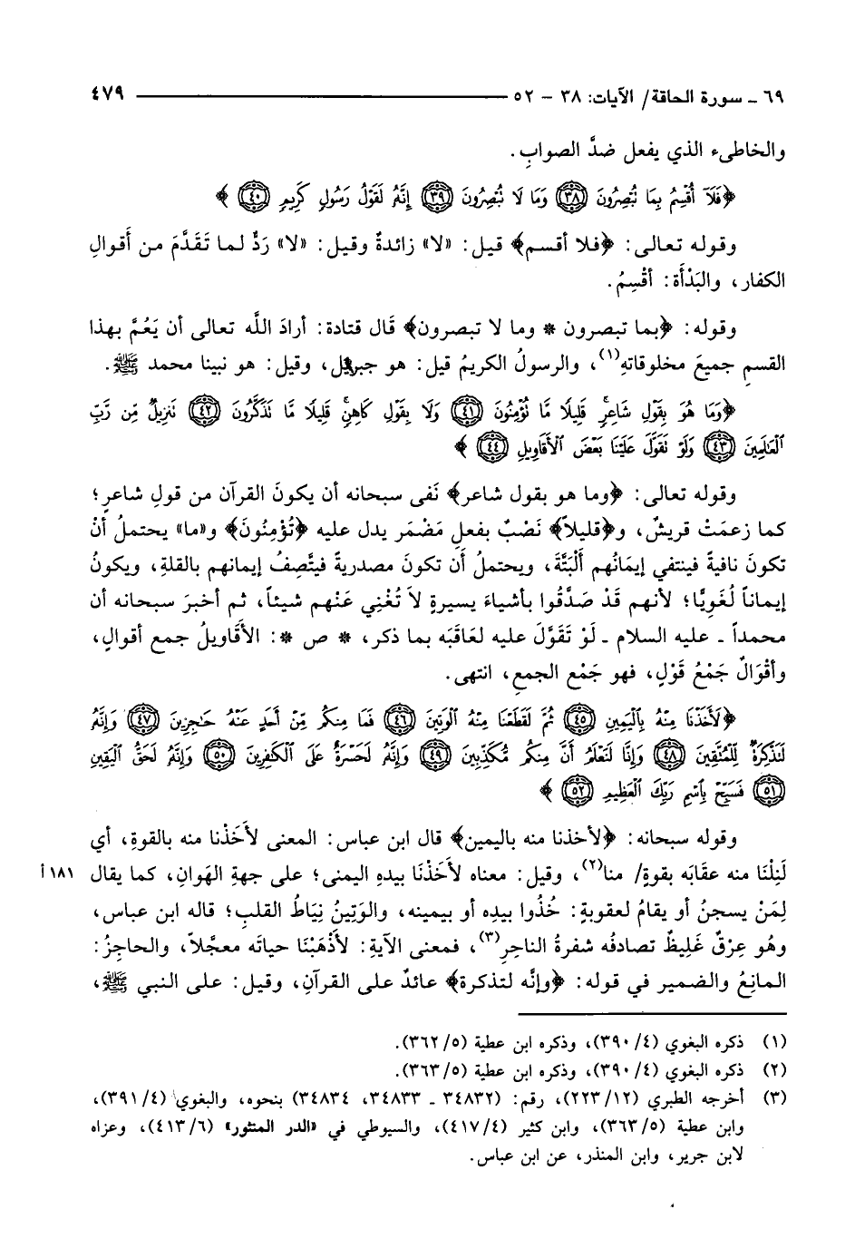 وقوله: بِما تُبْصِرُونَ وَما لاَ تُبْصِرُونَ قَال قتادة: أرادَ اللَّه تعالى أن يَعُمَّ بهذا القسمِ جميعَ مخلوقاتهِ «1» ، والرسولُ الكريمُ قيل: هو جبريلٌ، وقيل: هو نبينا محمّد صلّى الله عليه وسلّم.